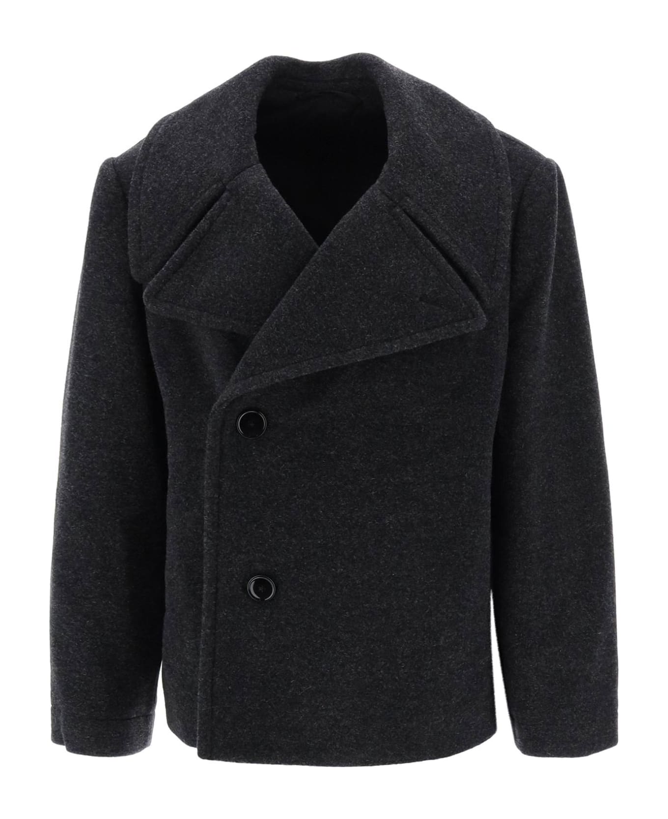 LEMAIRE peacoat crafted in melange-effect pure wool cloth with double-breasted design and four-button closure. It features convertible lapel with undercollar strap, side welt pockets and an internal pocket. Lined in cotton on the inside. Oversized fit with boxy cut. The model is 177 cm tall and wears size FR 34.