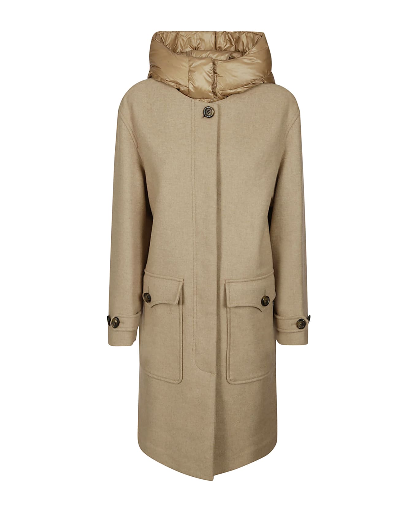 The WOOLRICH parka is made of a blend of recycled Italian wool from Manteco. The nylon hood is padded with duck down to ensure warmth and is removable for a versatile look. It has a hidden button closure and adjustable cuffs with tab and buttons. The understated silhouette of the model is enhanced by Western-inspired flap pockets and buttons.