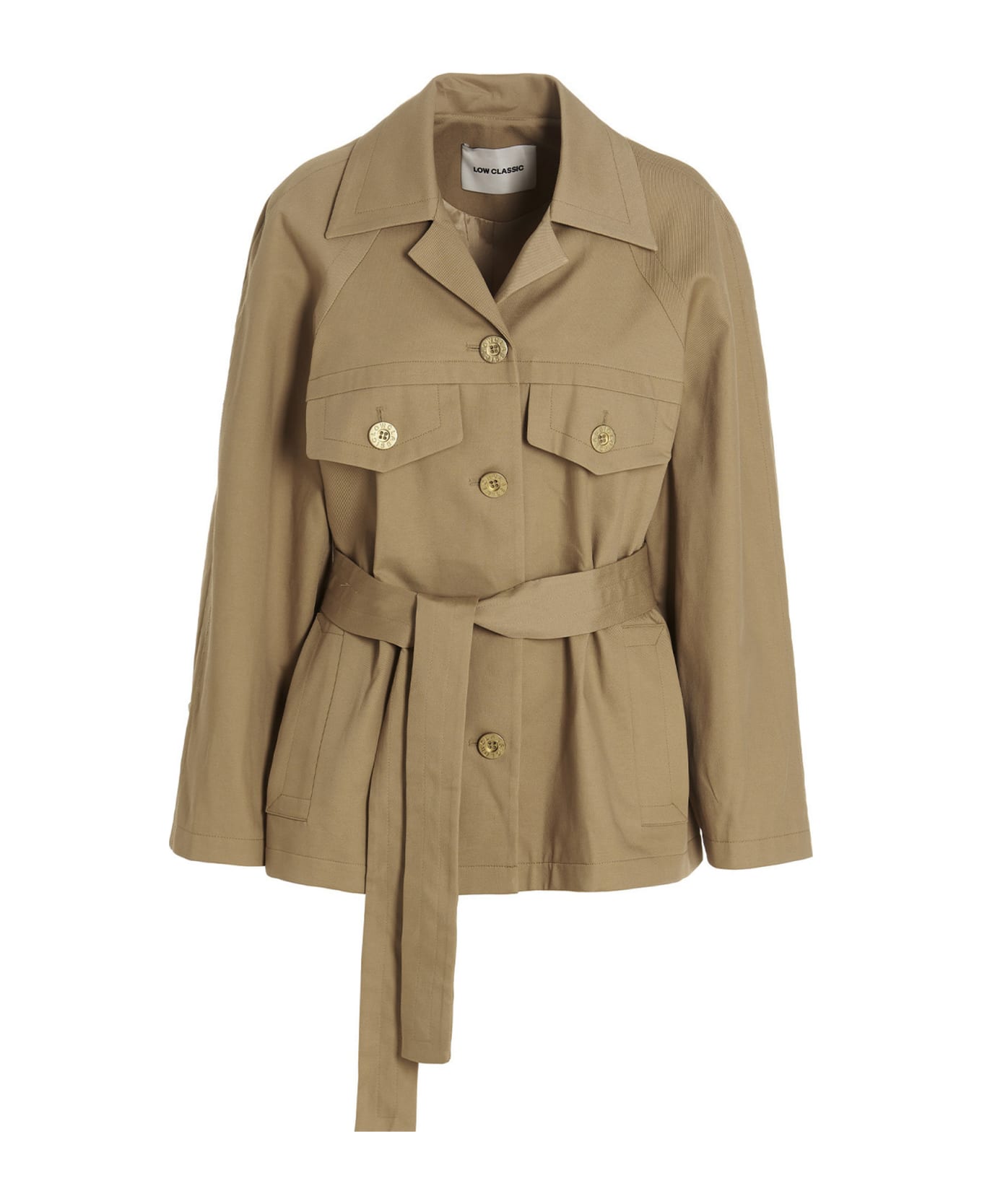 'Down Pocket' cotton blend jacket with button closure, pockets, belt at the waist and long sleeves.