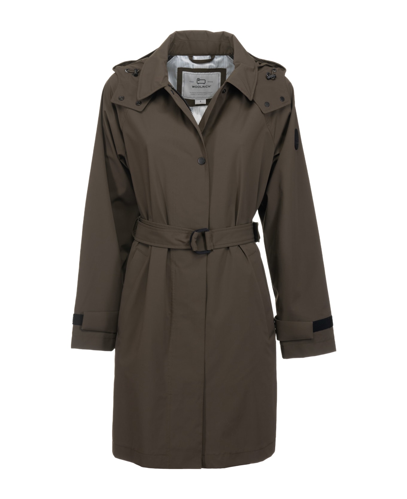 Military Green trench coat with hood, botton and belt closure from Woolrich. - fit the true size - made in extra EU - composition: polyester