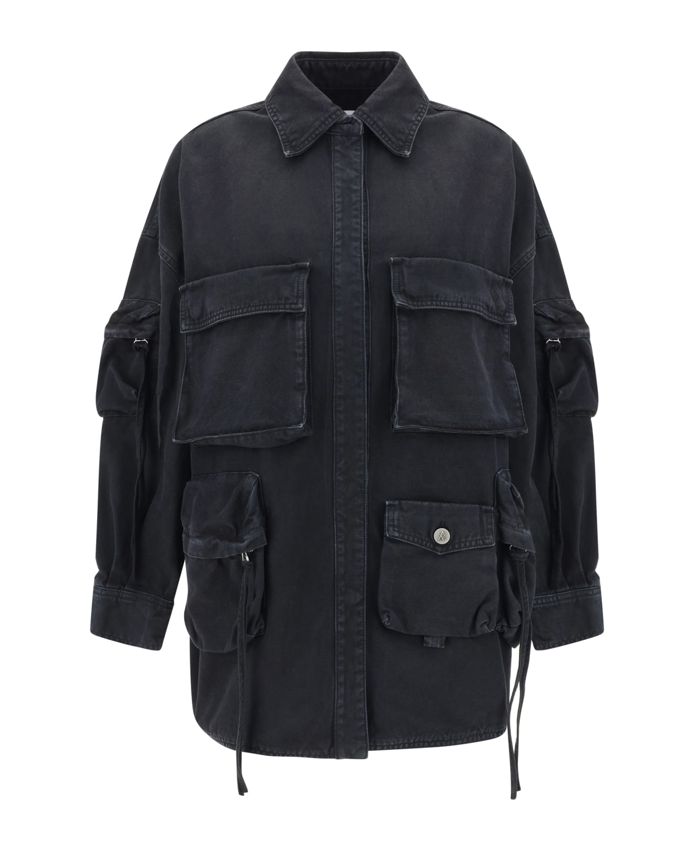Rayon fern coat by the attico, classic collar, front closure by matching buttons, wide oversized bell sleeves, asymmetrical hem, large cargo pockets attached to front panel, denim design, oversized fit. Composition: 70% % Rayon, 30% % Polyamide