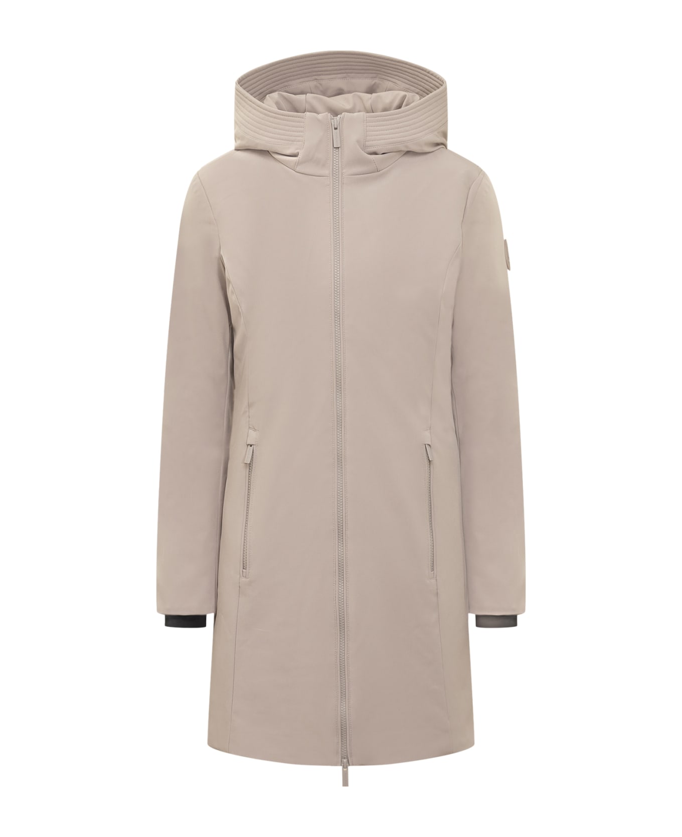 Long parka with hood. Zip pockets. Patch logo. Zip closure.