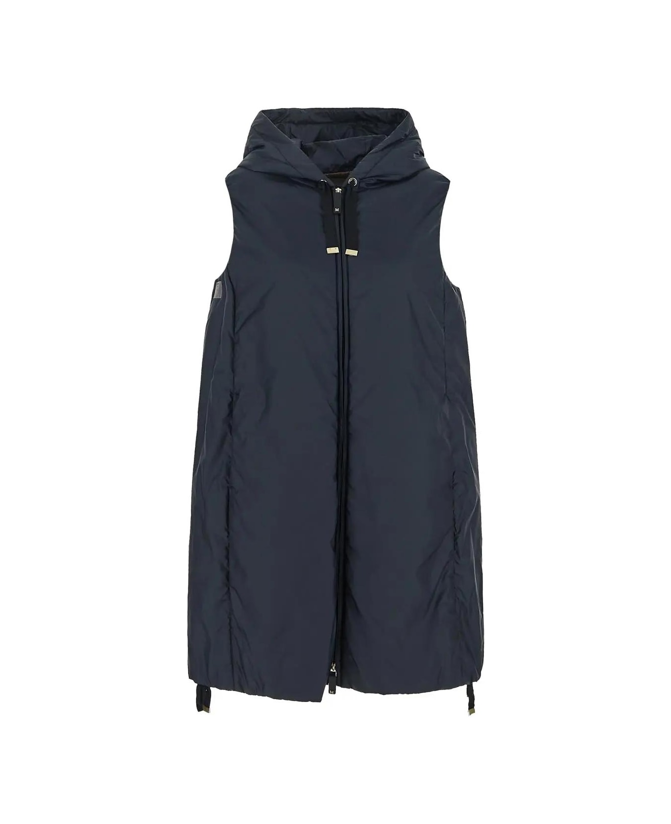 Max Mara The Cube quilted vest coat in navy polyester featured by a hood with flat drawstring and gold metallic aglets, concealed double-ended zip closure with leather tip and logo plaque, sleeveless, A-line, side pockets and drawstring at the bottom.