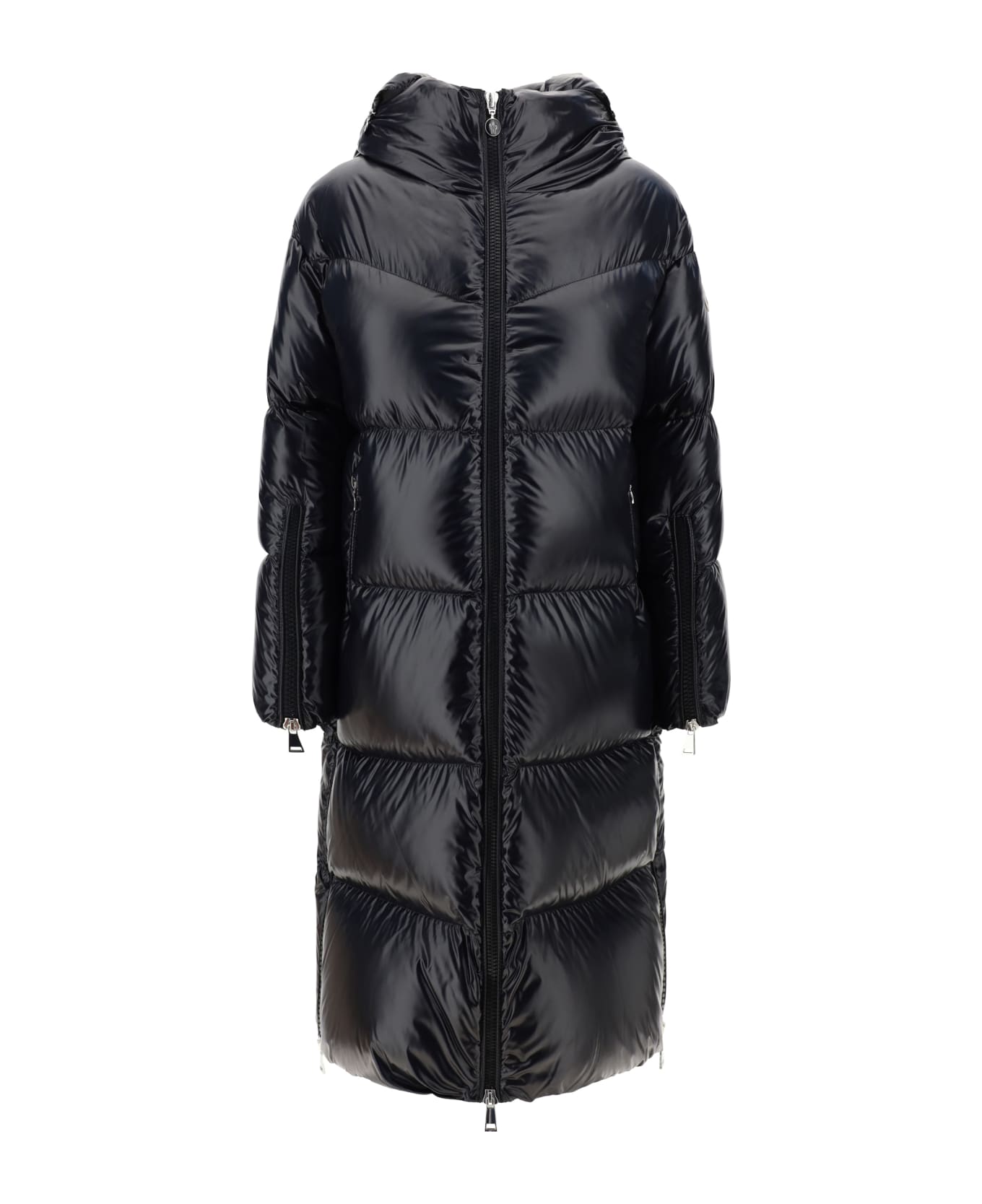 Huppelong Down Jacket By Moncler, High-necked Hooded Design, Front Zipper Closure, Two Front Patch Slit Pockets, Padded And Quilted Design, Monochrome Pattern, Two Zippered Side Slits, Foot-length Pattern, Iconic Brand Logo Applique On Sleeve, Regular Fit.