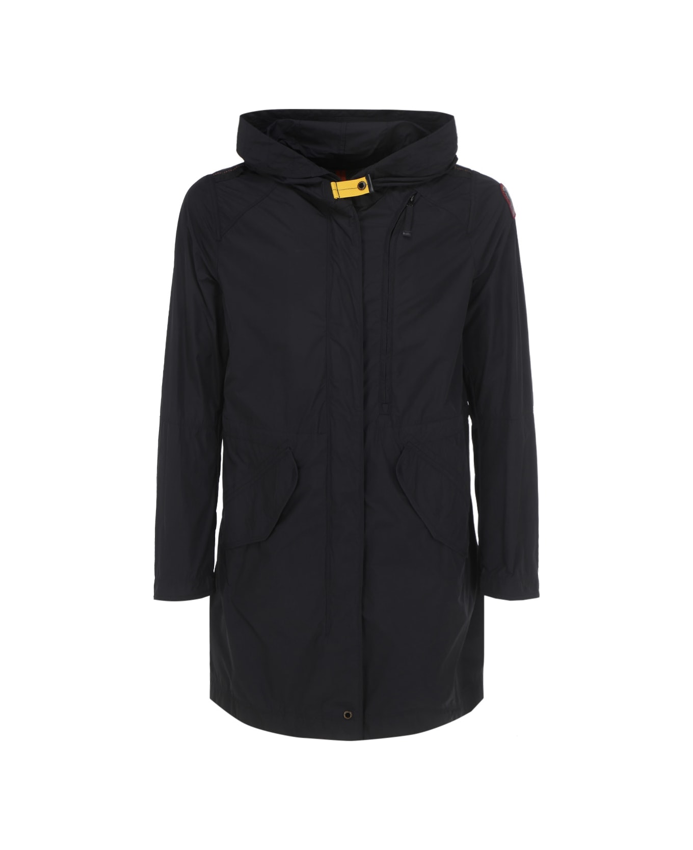 Jacket by parajumpers, adjustable drawstring hoodie, zip closure with snap button flap, two snap button pockets and one zip pockets on front, patch logo on left sleeve, back slit with adjustable drawstring.