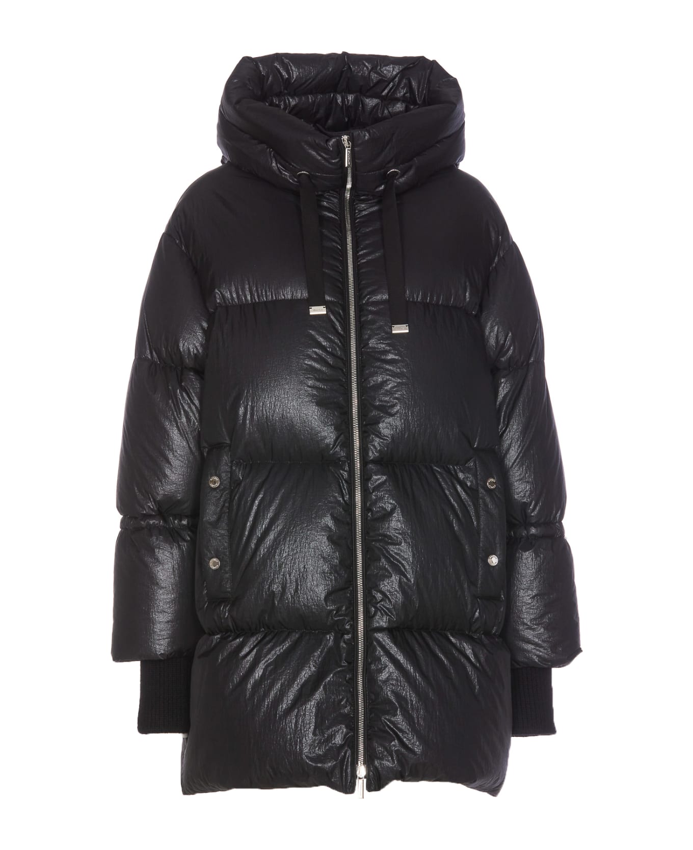 Moorer black Justine down jacket with frontal zip closure, hood detail, lateral pockets with button closure, long sleeves, elasticized cuffs, padded Composition: 100% Polyamide, 100% Virgin Wool