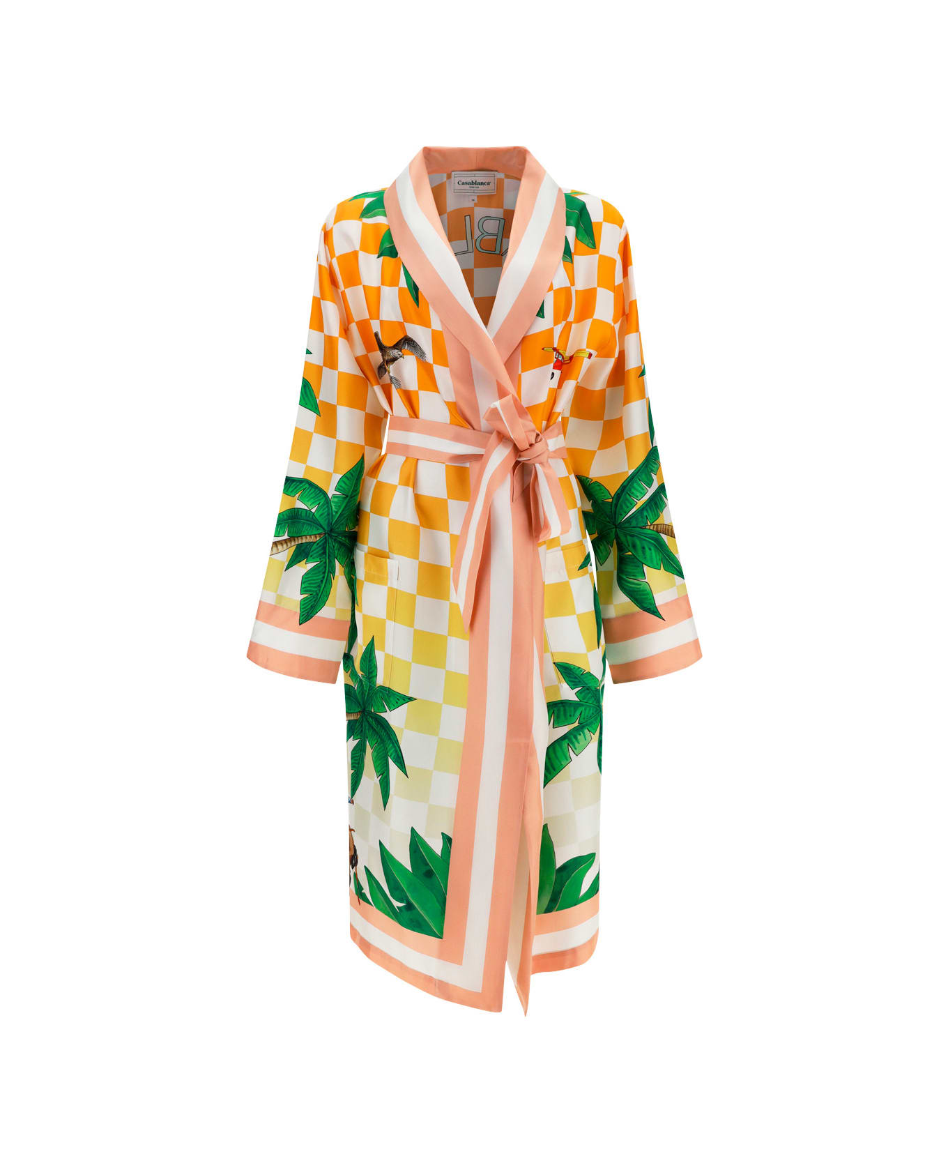 Silk kimono dress by casablanca, model with matching sash to be tied at the waist, iconic all-over printed multicolour graphic pattern, two welt patch pockets on the front. Composition: 100% % Silk