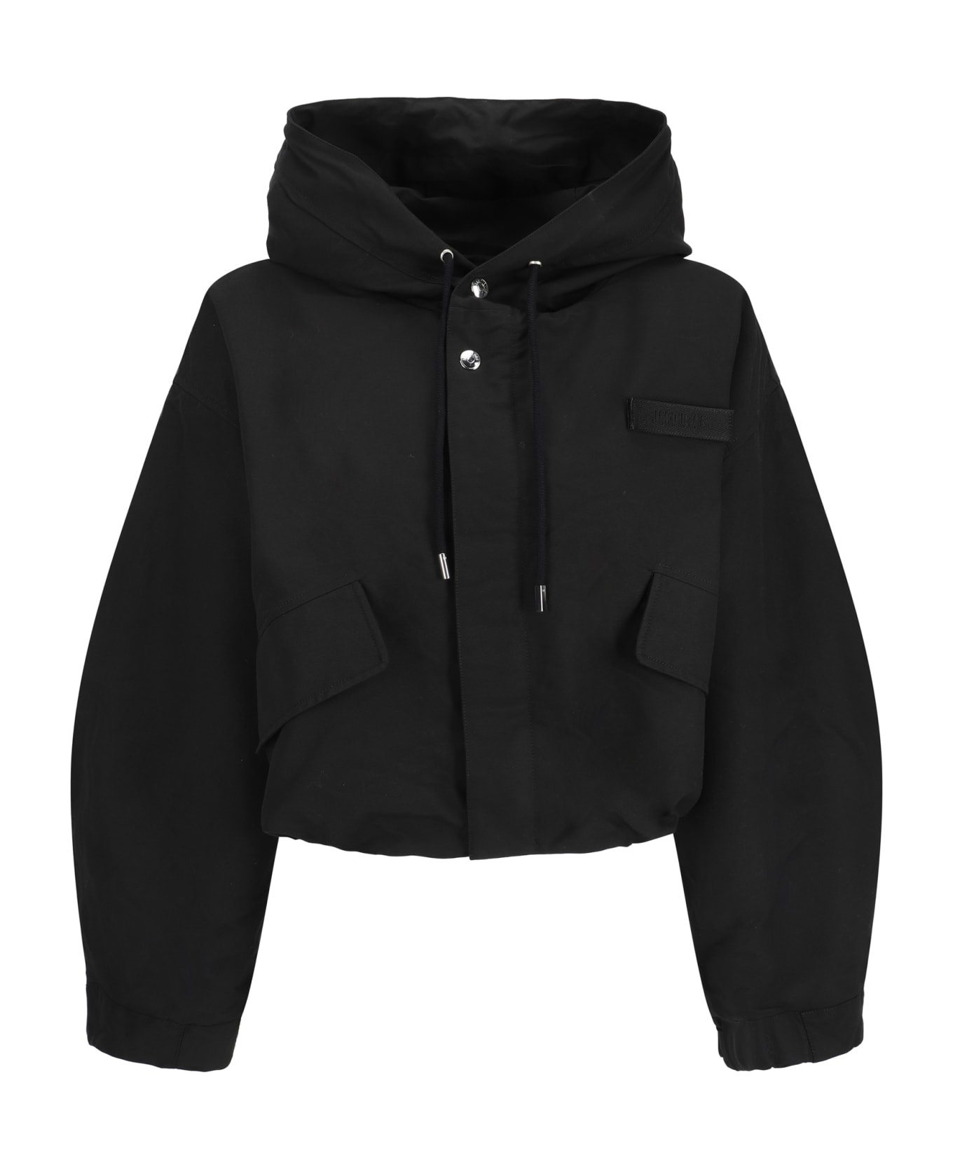 La parka courte caraco jacket from jacquemus, cropped design with drawstring-adjustable hood, front closure by zipper and magnetic buttons, two front flap welt pockets, drawstring-adjustable hem, button-adjustable sleeves, patch with iconic brand monogram appliqué on front, monochrome pattern, regular fit.