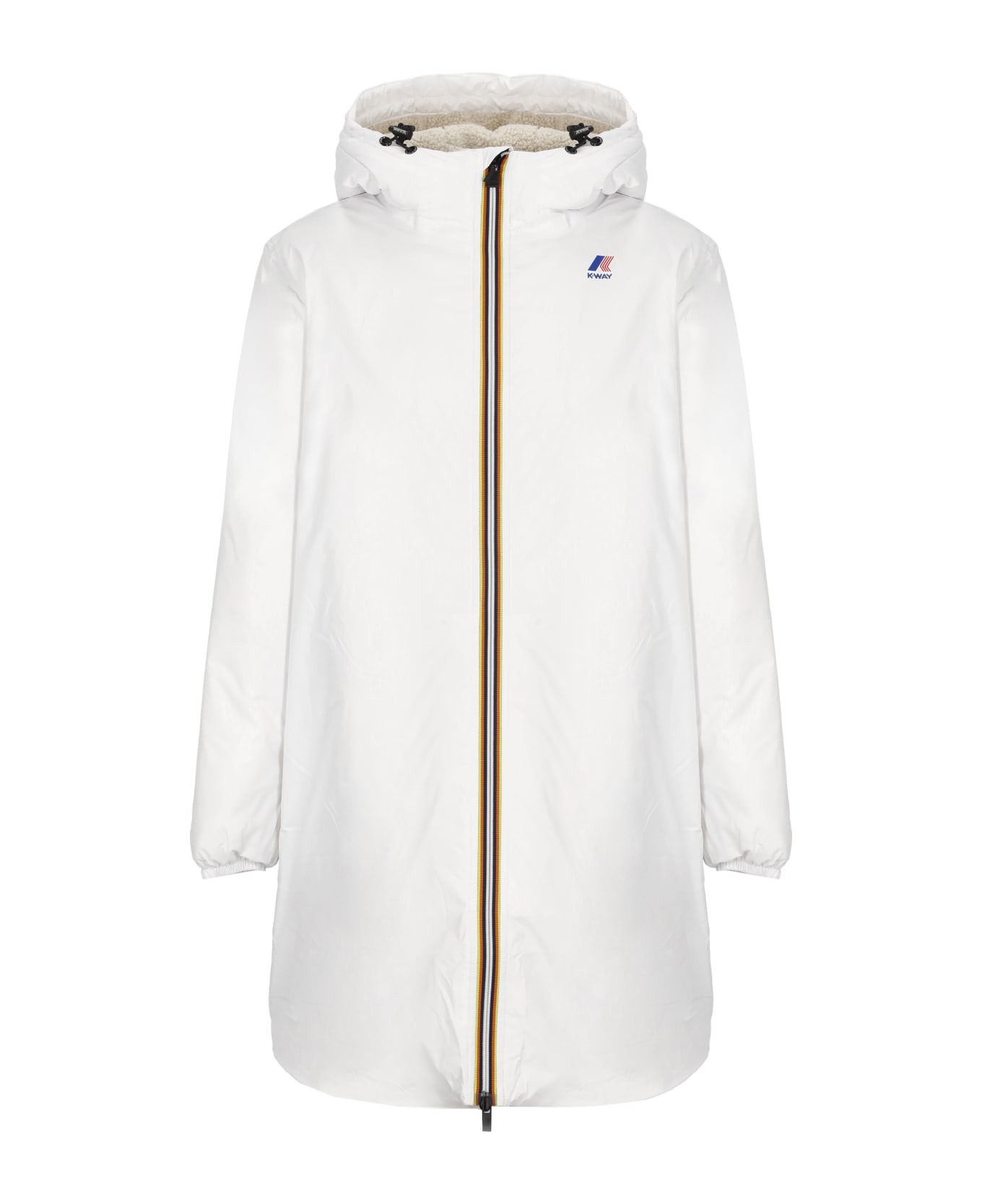 Le Vrai 3.0 Eiffel Orsetto Padded Coat from K-Way: - White K-Way waterproof fabric padded coat for woman - Hood with drawstrings - Long sleeves with elastic at cuffs - Front contrasting color printed logo - Two front zip pockets - Front zip fastening - Synth fur interior - One internal pocket - Front contrasting color gros grain iconic band