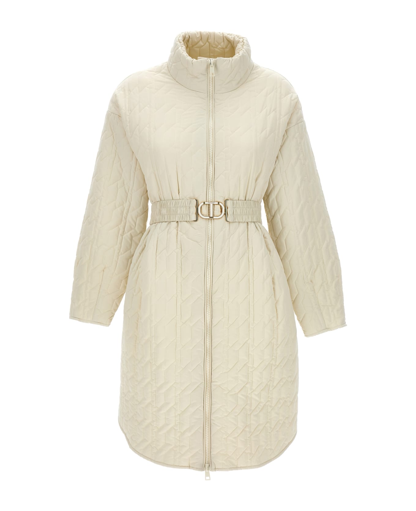 Long quilted down jacket, zip closure, high neck, pockets, long sleeves.