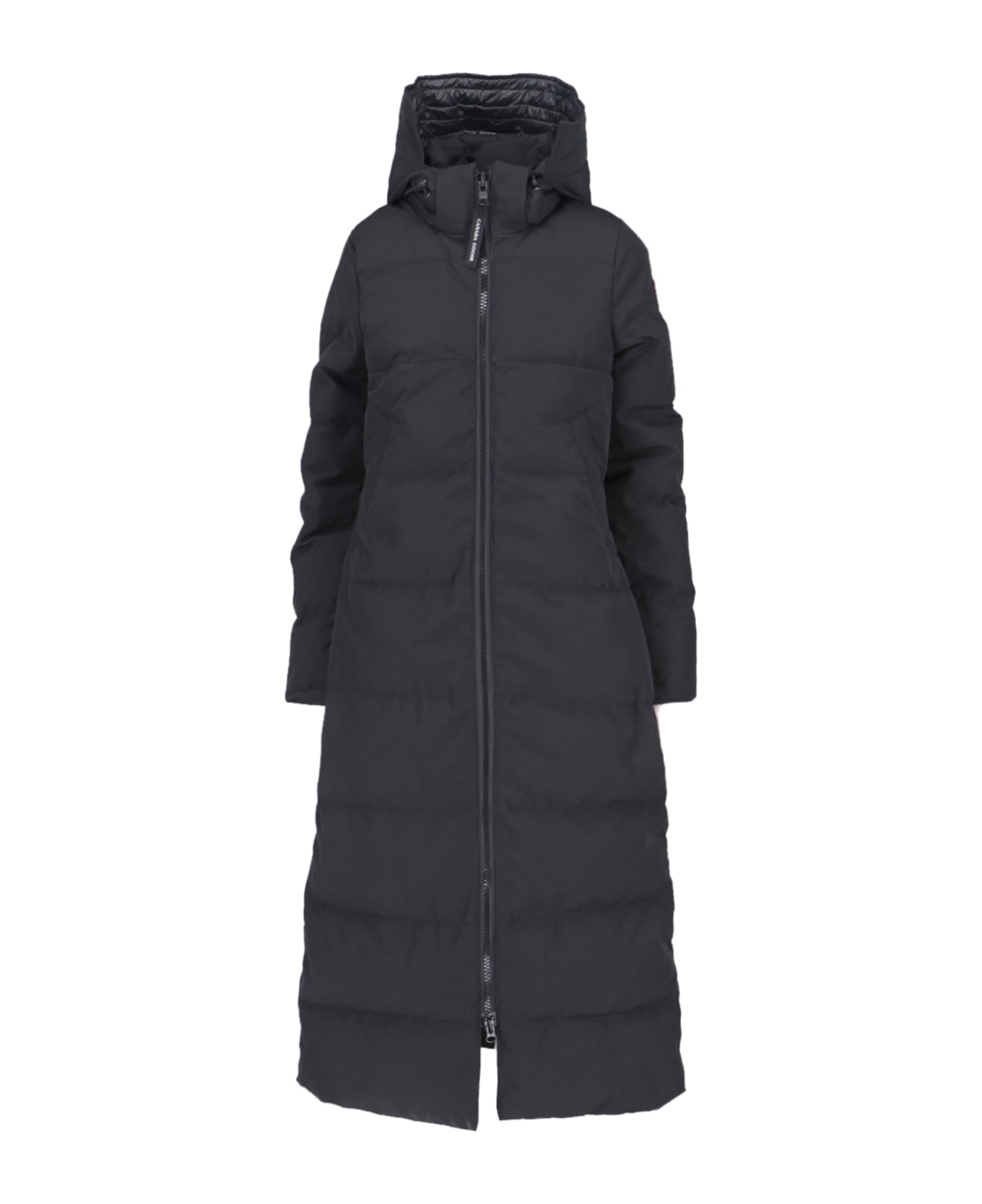 Canada Goose Mystique long parka in black fabric with padded design, drawstring hood, zip closure, two side pockets, logo patch sleeve, inner braces, straight hem. Composition: 83% Polyester, 17% Cotton