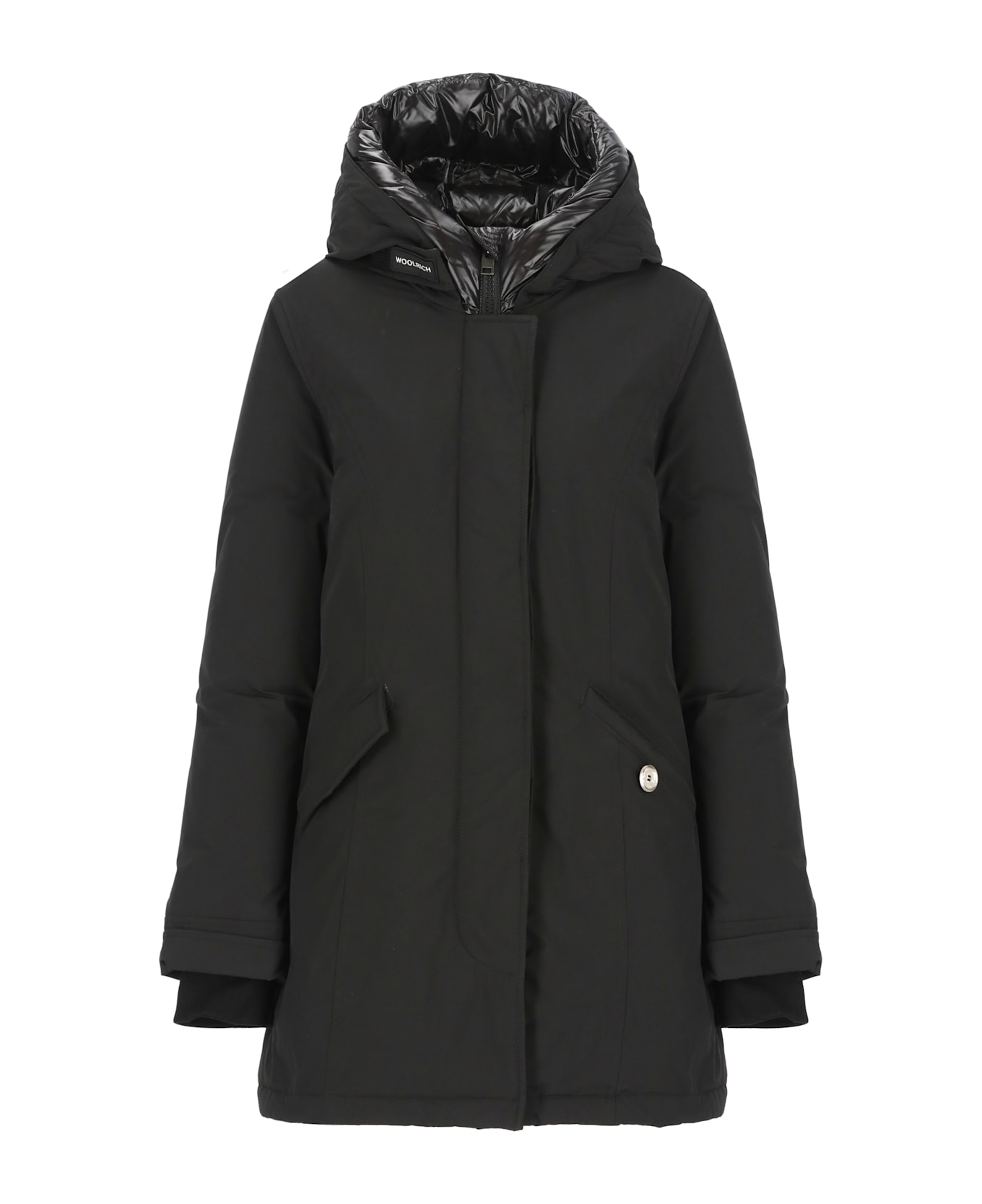 - Black Woolrich parka for woman - Hood with logo - Long sleeves - Two front flap pockets - Front zip and buttons fastening
