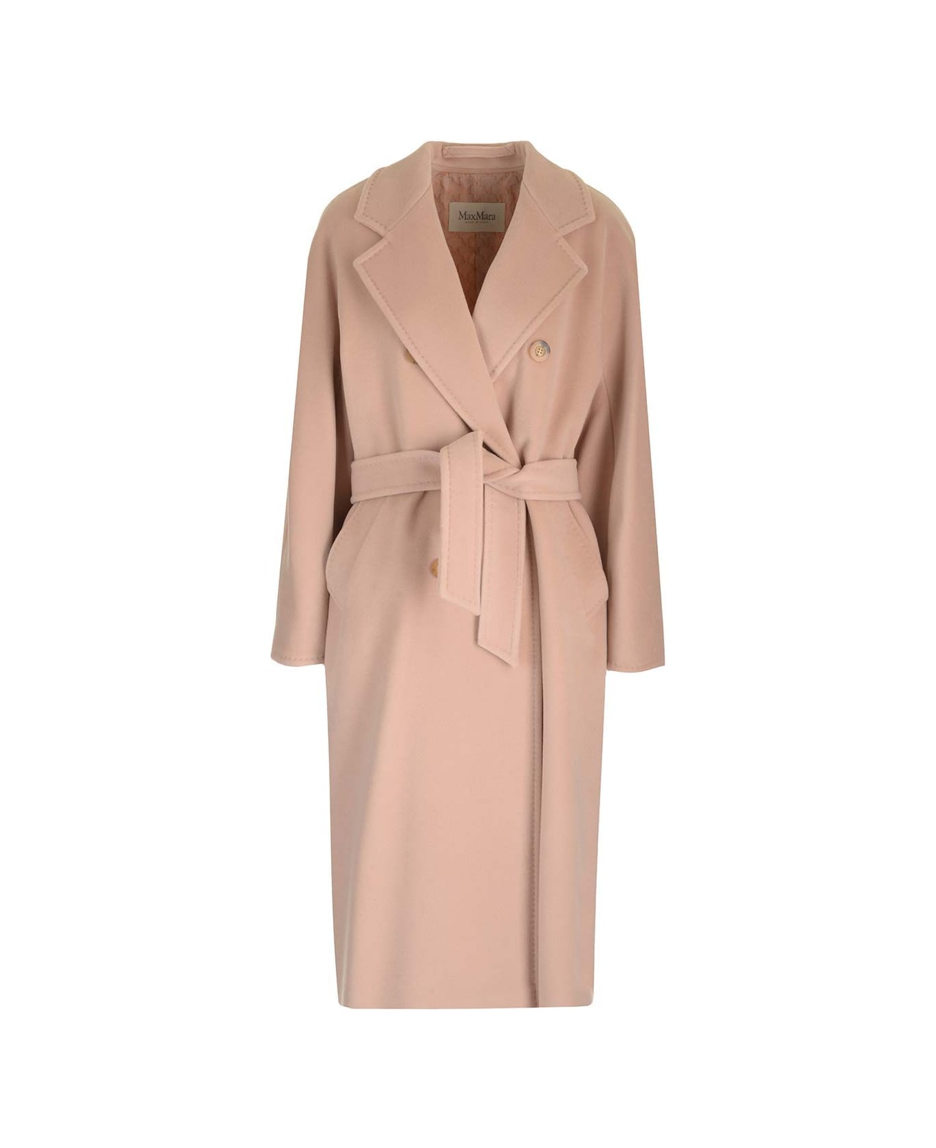"Madame" coat by Max Mara in wool and cashmere, entirely hand-sewn. Classic double-breasted silhouette, finished with classic lapels, a detachable belt and side slit pockets.