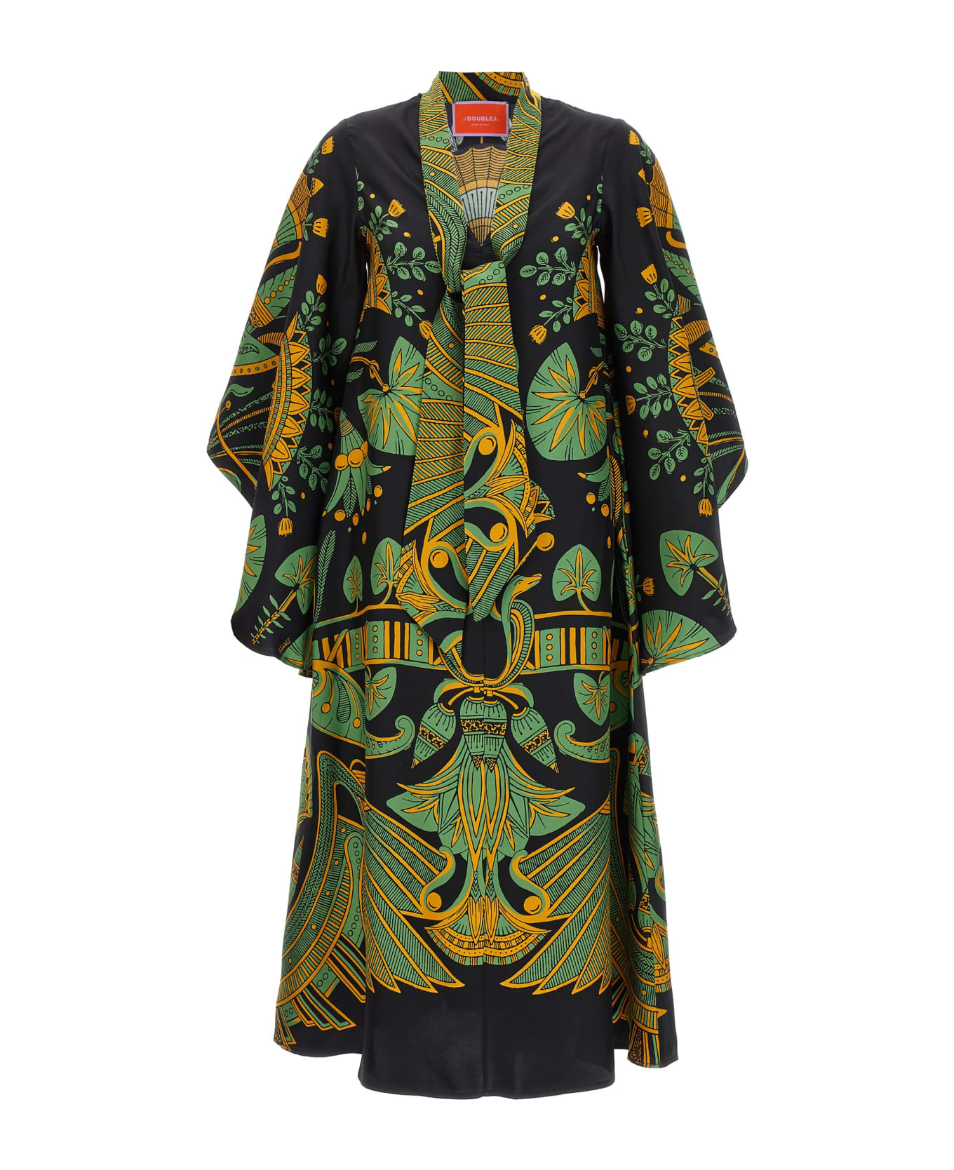 'Magnifico' dress in silk with all-over print, V-neck with tie sash, long and wide sleeves. Composition: 100% silk