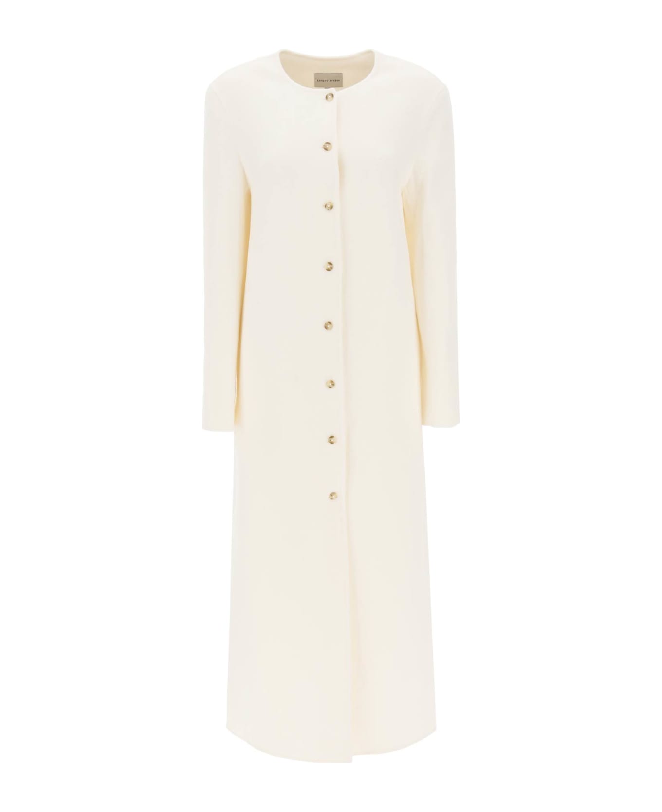Deconstructed maxi coat by LouLou Studio made from wool and cashmere blend with single-breasted design and front button closure. Crew-neck design unlined on the inside featuring side seam pockets and deep side slits. Regular fit with straight cut. The model is 177 cm tall and wears size S.