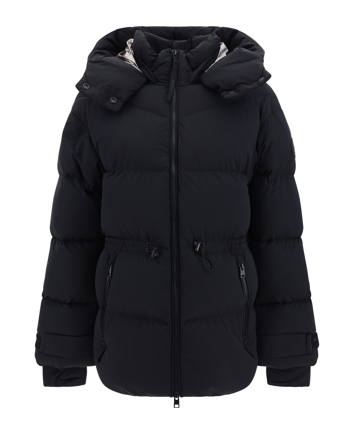 Matt down jacket by woolrich, double-slider front zipper closure, removable hooded design, all-over padded and quilted design, elasticated drawstring detail around bust two zippered side welt pockets, elasticated ribbed cuffs, velcro patch and iconic brand monogram applied on cuff, brand logo patch applied on left shoulder, regular fit.
