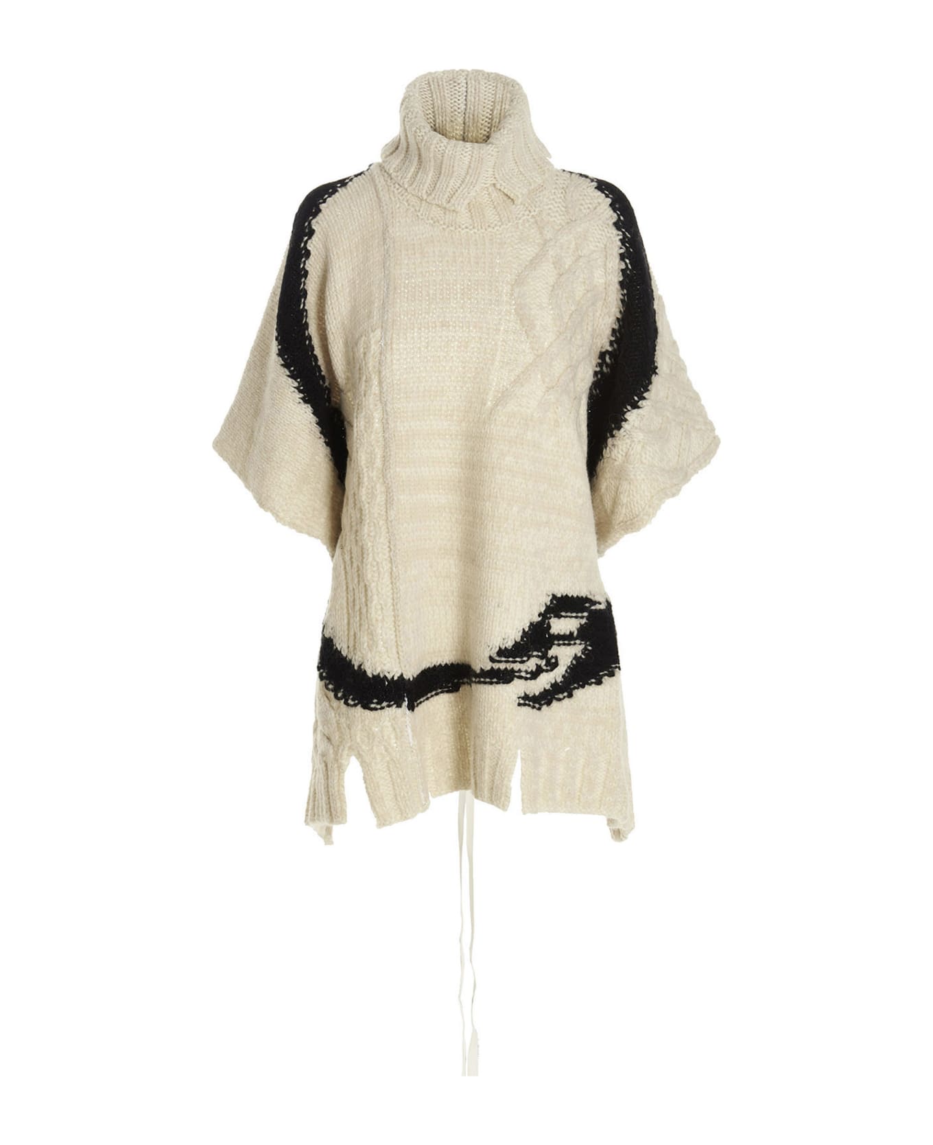 Wool blend cape with maxi logo at the front, high neck and a lace-up back. The peculiarity of the garment is given by the raw fabric that tends to parading. This is to be considered a deliberate feature and therefore the peculiar feature of the garment itself. This garment has also been made with different materials, the possible differences in color are characteristic of the same. Composition: 84% wool 7% polyamide 5% acetate 4% alpaca wool