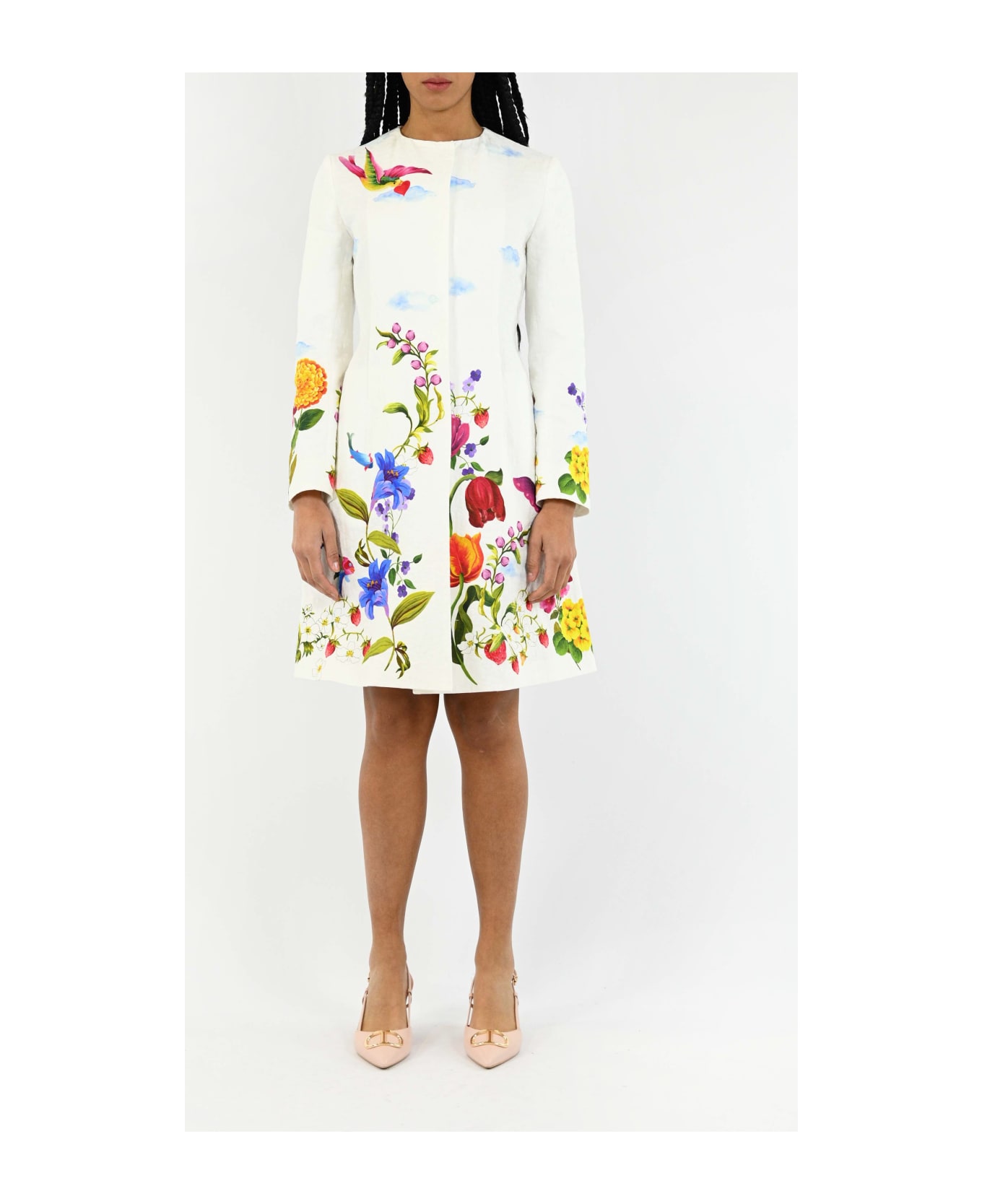 coat in pure jacquard cotton with printed heart motif, with a soft, slightly a-line line, closed with a gros-grain belt. round neckline and long sleeves. composition and washing