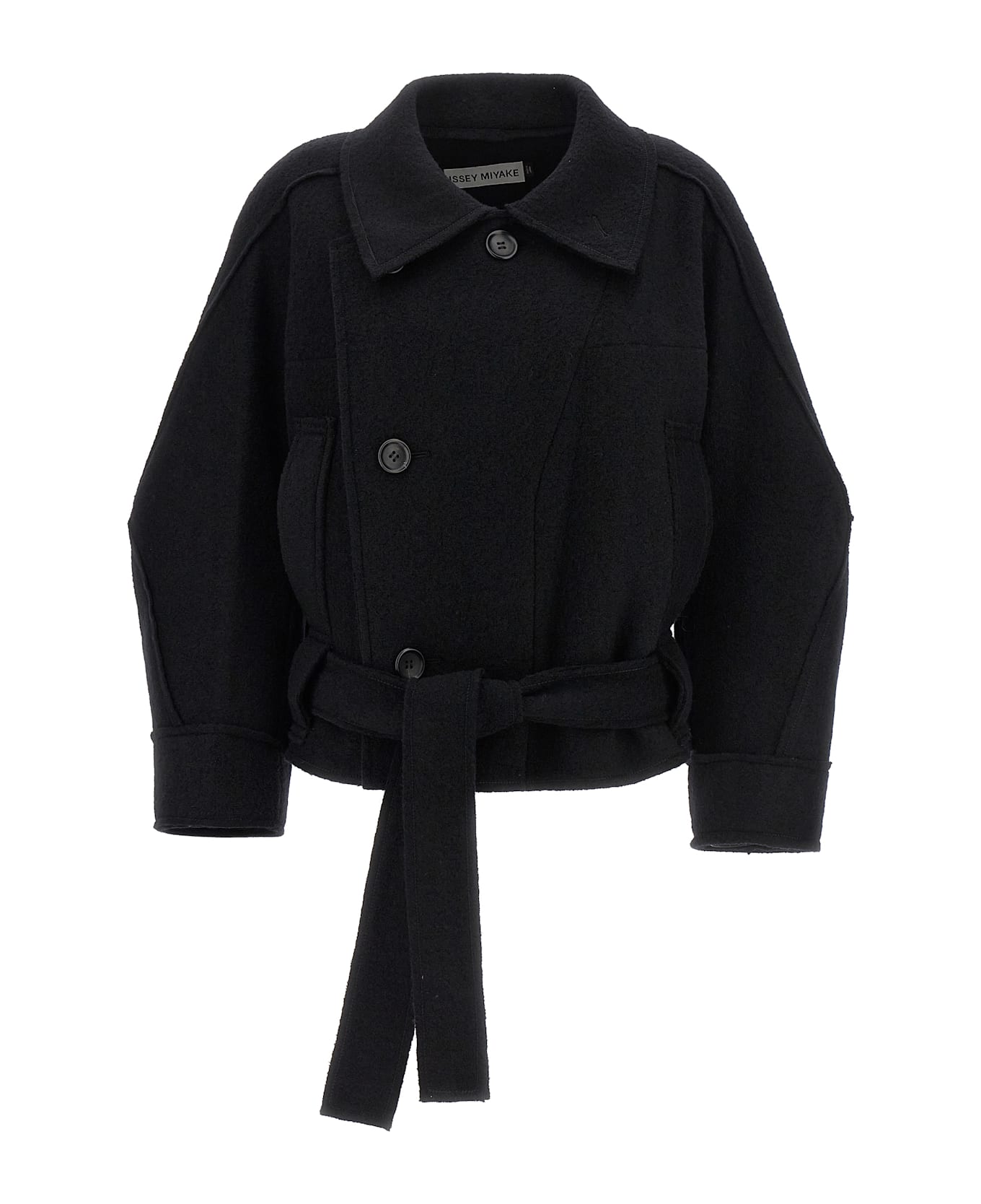 'Out of a Cube' short wool blend coat with button closure and belt at the waist, long sleeves.