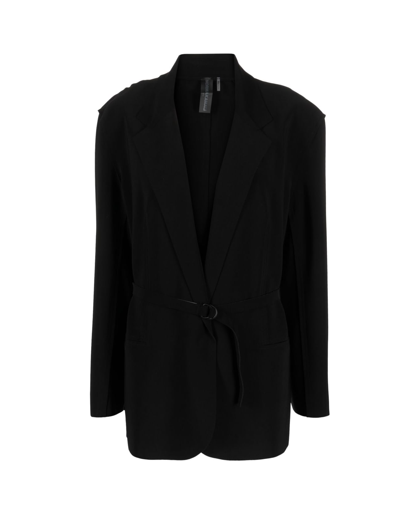black notched lapels belted waist two front patch pockets shoulder pads long sleeves straight hem Composition: 95% Polyester, 5% Elastane