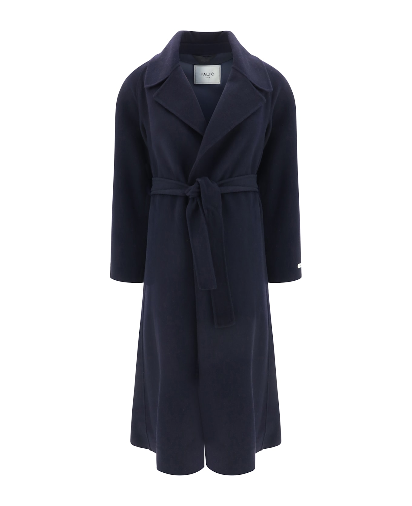 Wool paola coat by paltò, wide classic lapels, knotted sash waistband, two side welt pockets, back slit, monochrome pattern. Composition: 80% % Wool, 20% % Polyamide