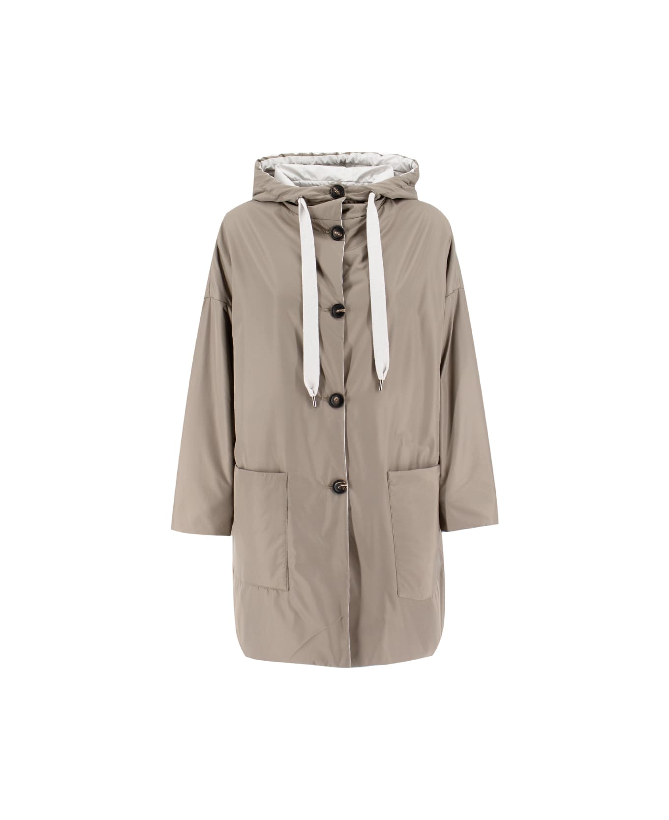 Soft and snug double face parka made of lightweight technical fabric, large hood with drawstring, button fastening, two side pockets, regular fit.