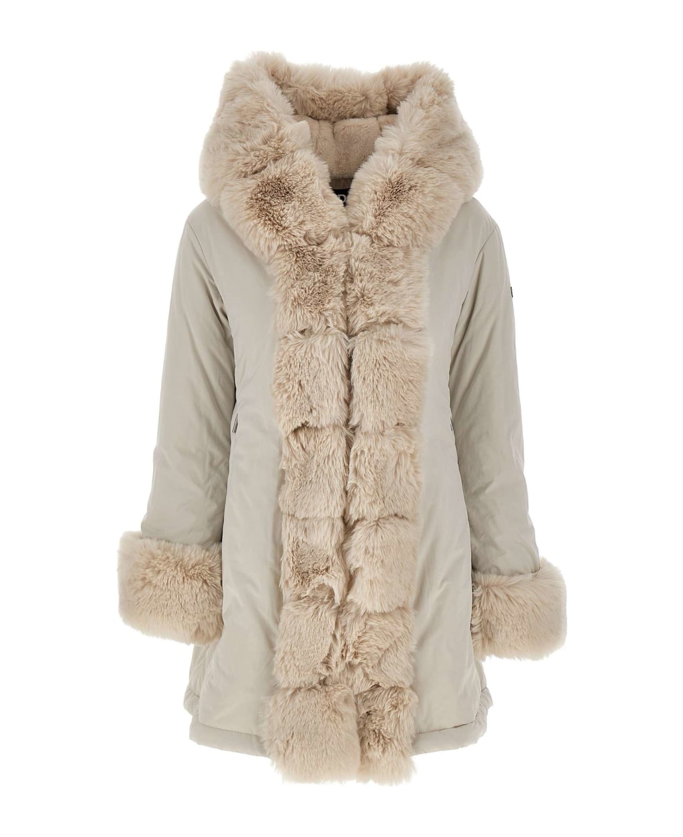 Freedomday women's parka, "Pearl", pearl white colour, large fixed hood with fur lining, front fasting with hooks, fur inserts on wrists and on front, two front handwarmer pockets with zip, logo patch applied on left sleeve, double adjustable drawstring on waist and bottom.