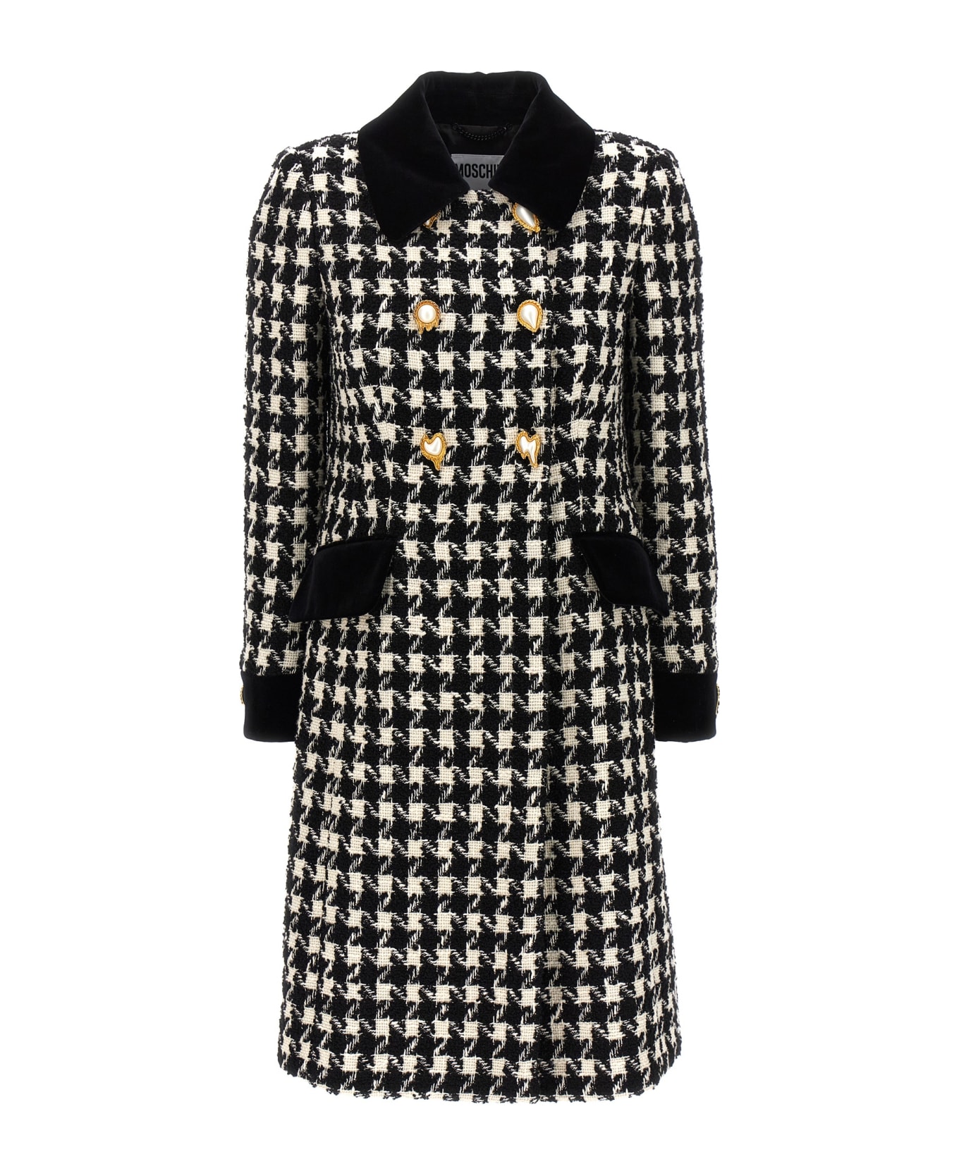 Double-breasted houndstooth coat, velvet details, button closure, pockets, and long sleeves. Composition: 74% wv 20% cotton 6% pa