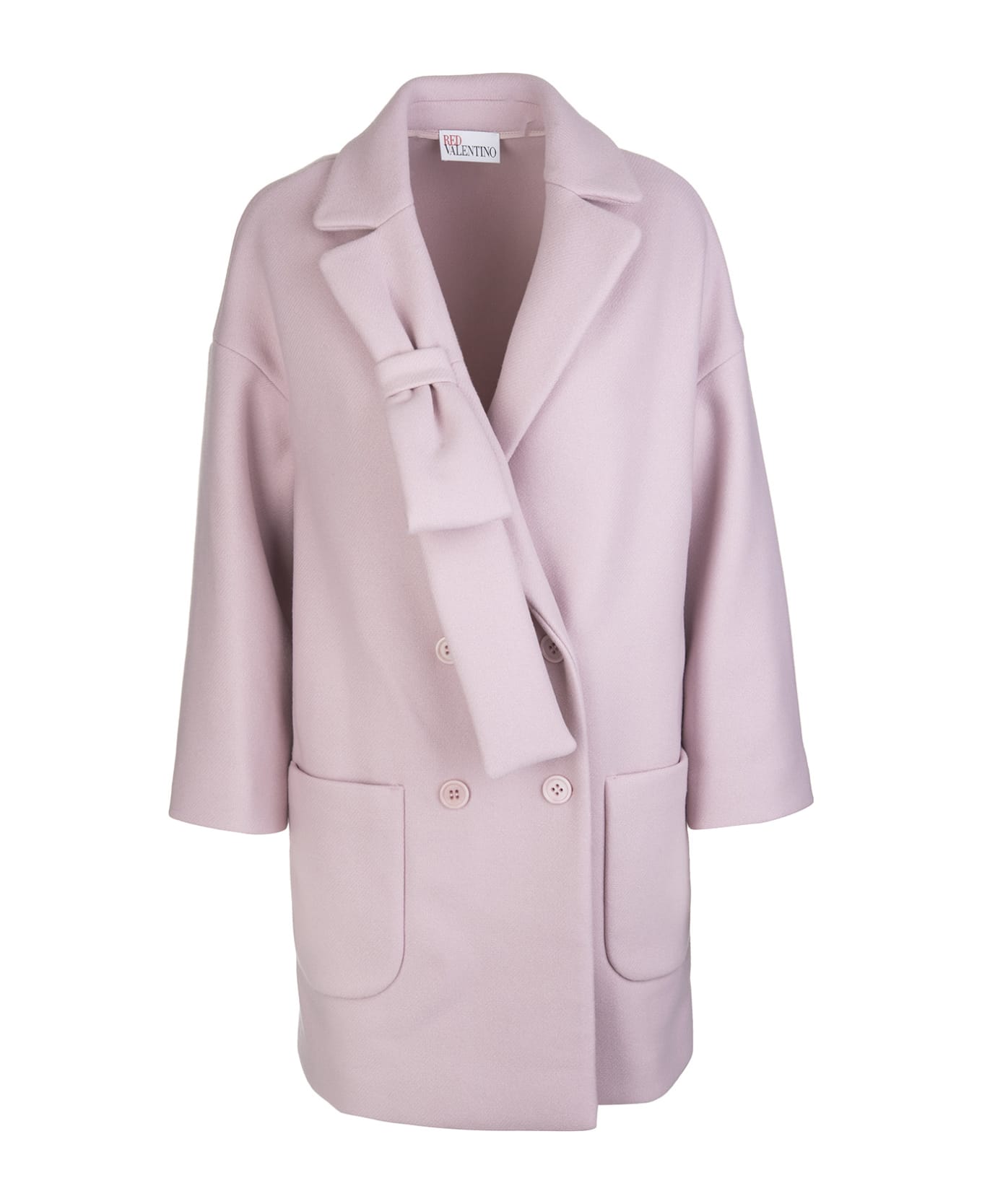 Double-breasted over coat by REDValentino made of pink double cashmere cloth with large lapel enriched by a tone-on-tone bow. Model featuring a straight cut, long sleeves, side patch pockets and a front placket with matching buttons. Length in size 40: 85 cm.