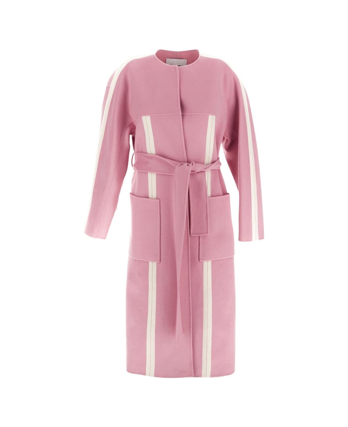 K Krizia coat in pink wool with side ivory stripes. It features by no closure, round neck and patch pockets.
