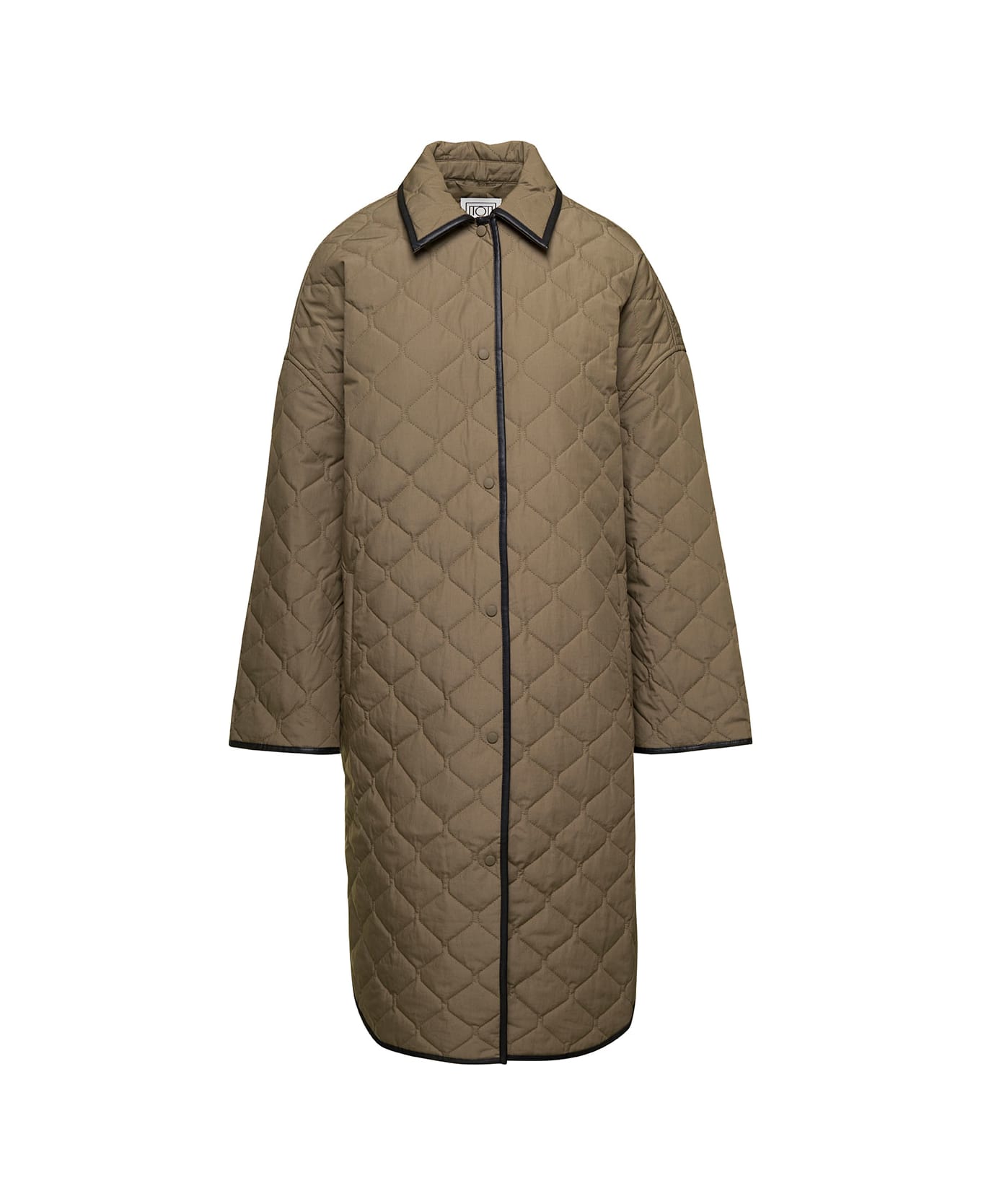 Cocoon coat Quilted Classic collar Leather trims Long sleeves Front button fastening Covered buttons Curved hem Beige Cotton Oversized fit