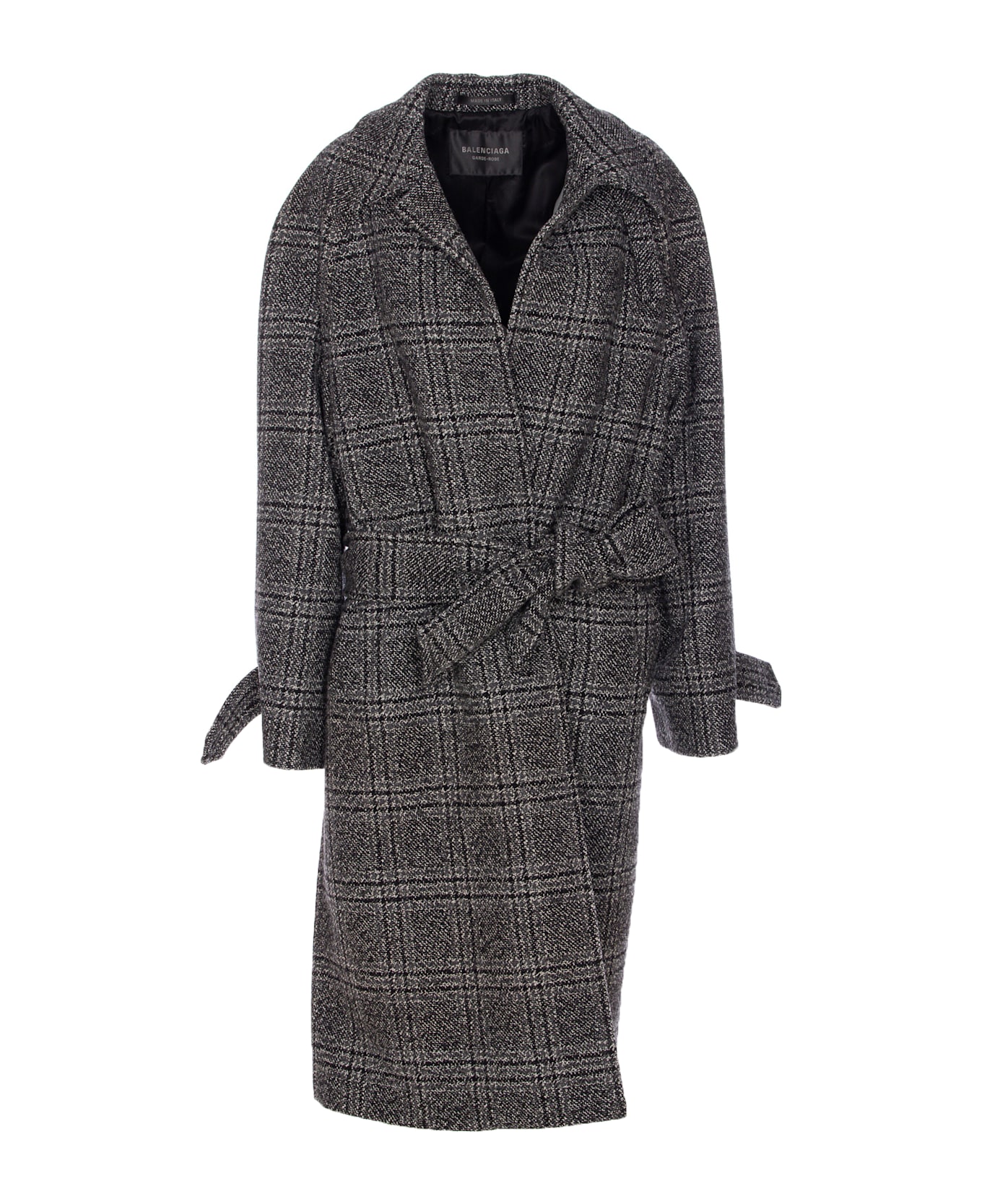 Balenciga grey One Layer coat with belt closure on waist, long sleeves, tartan motif, pockets, strap on cuffs, split on the back Composition: 100% Wool, 100% Cupro, 100% Cotton