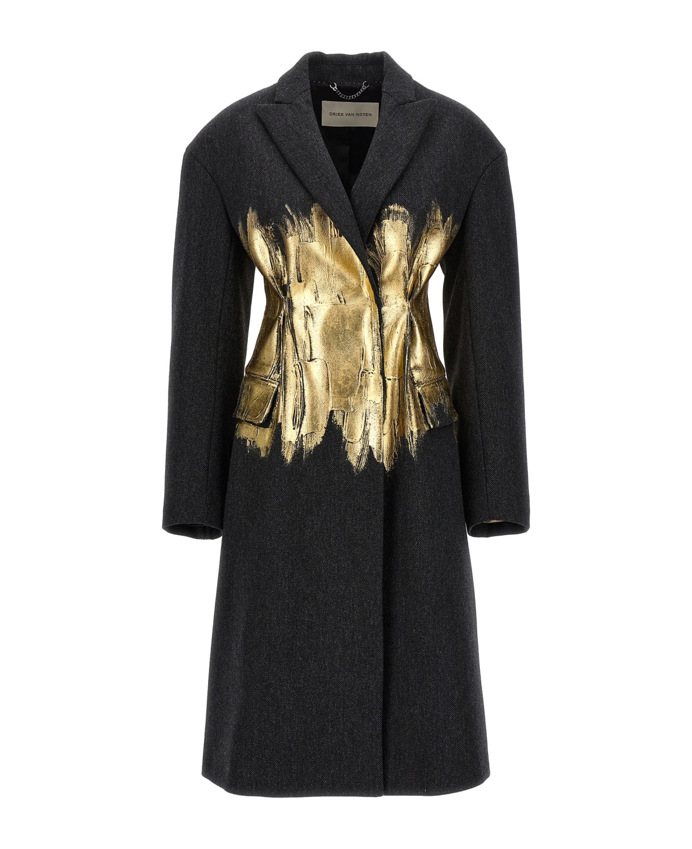 'Ravis' chevron wool coat with contrasting gold print, button closure, pockets, long sleeves, back split.