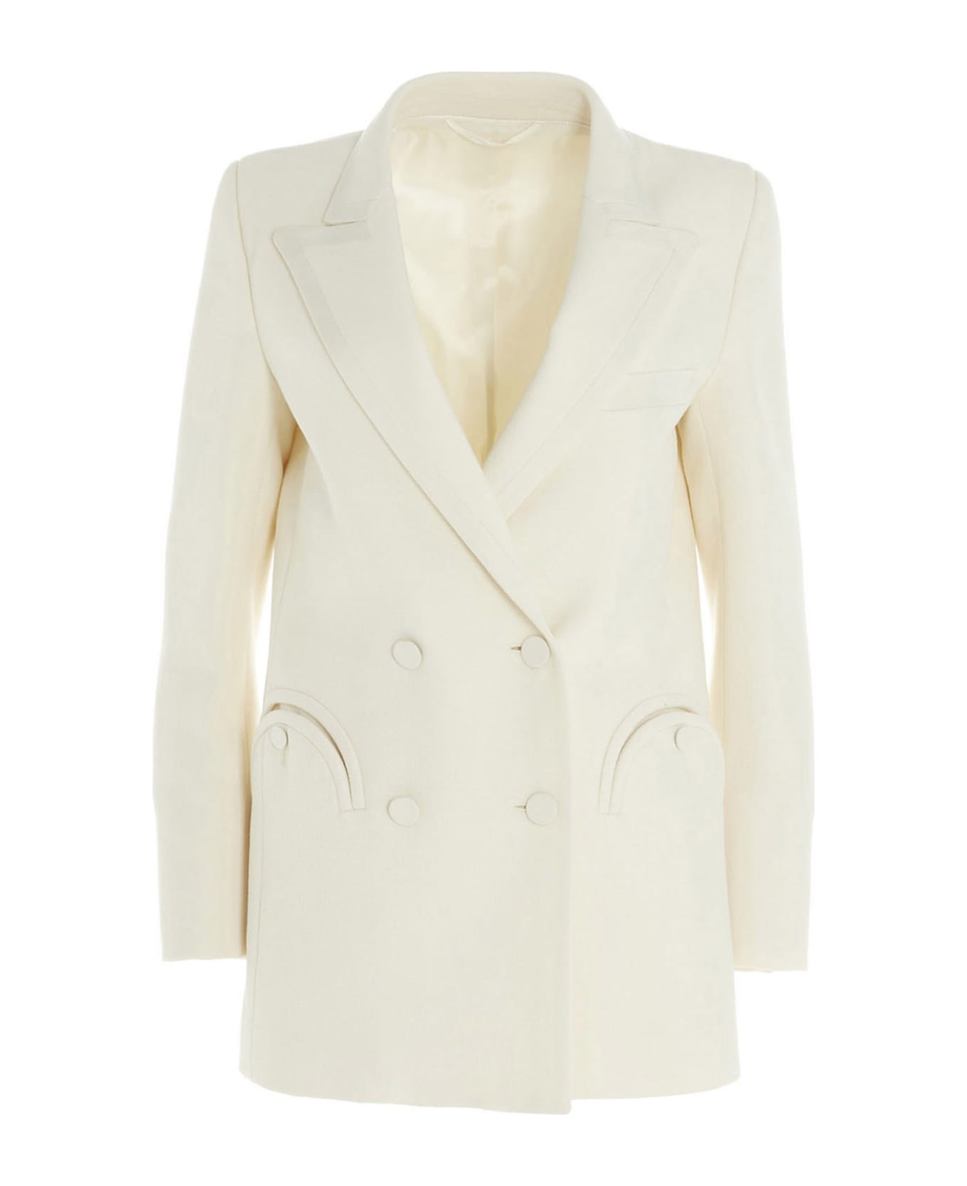 'Resolute Cream Everyday' double-breasted wool blazer with grosgrain trims, button closure, pockets, back split and padded shoulders.