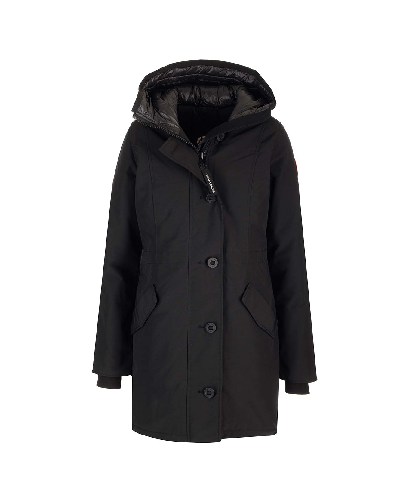 Black "Rossclair" parka from Canada Goose padded with down with internal straps that allows you to carry the jacket hands-free. Waist with internal drawstring to customize the fit and retain heat, ribbed knit cuffs for greater comfort and retain heat. Two-way zip and button closure, longer hem at the back. Slim fit.