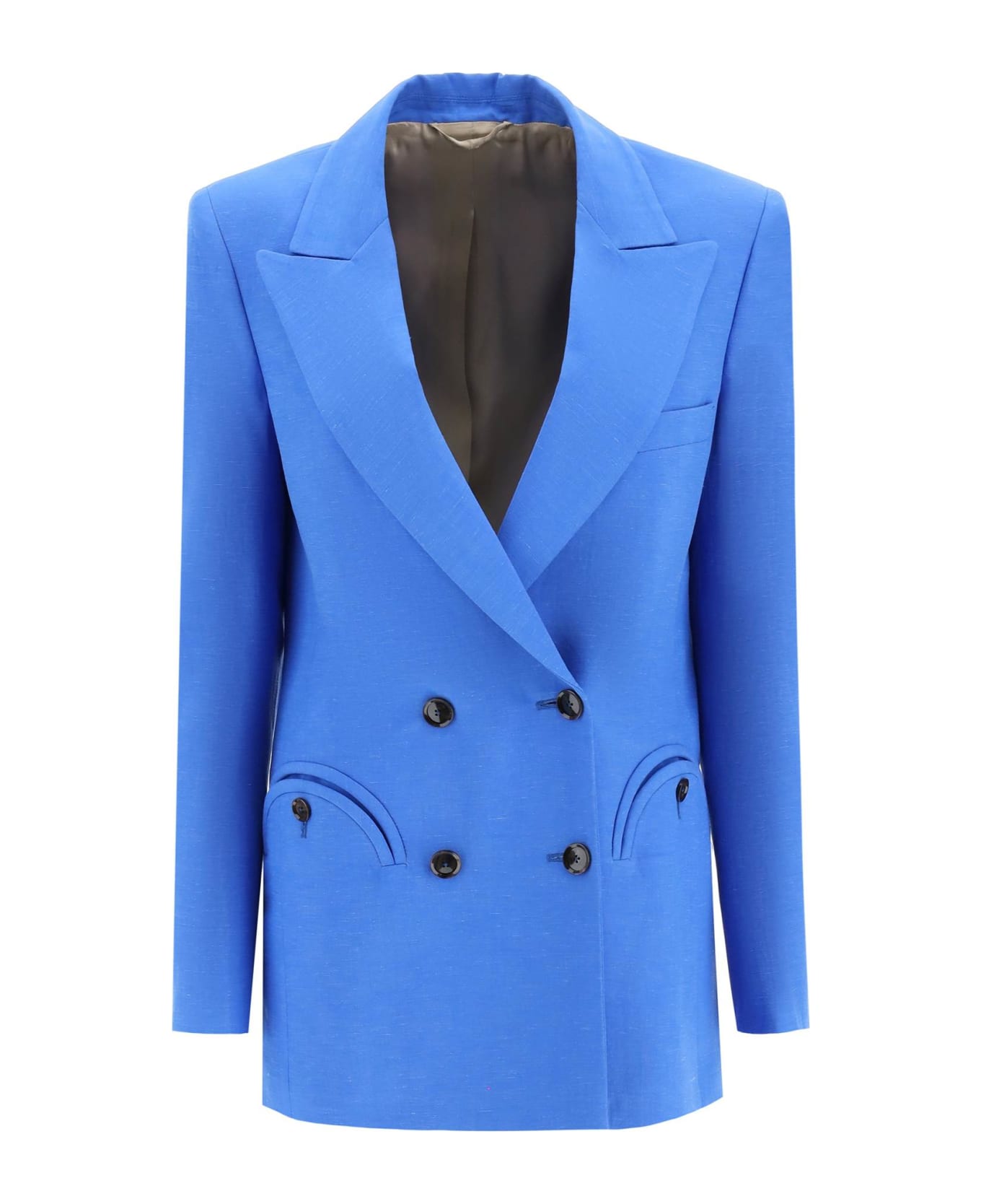 Blazé Milano viscose and linen canvas blazer with four button closure. It features padded shoulders, peak lapels, smiley pockets, a chest pocket and central back vent. Lined, with four inside pockets. The model height is 177 cm and she is wearing a size 1.