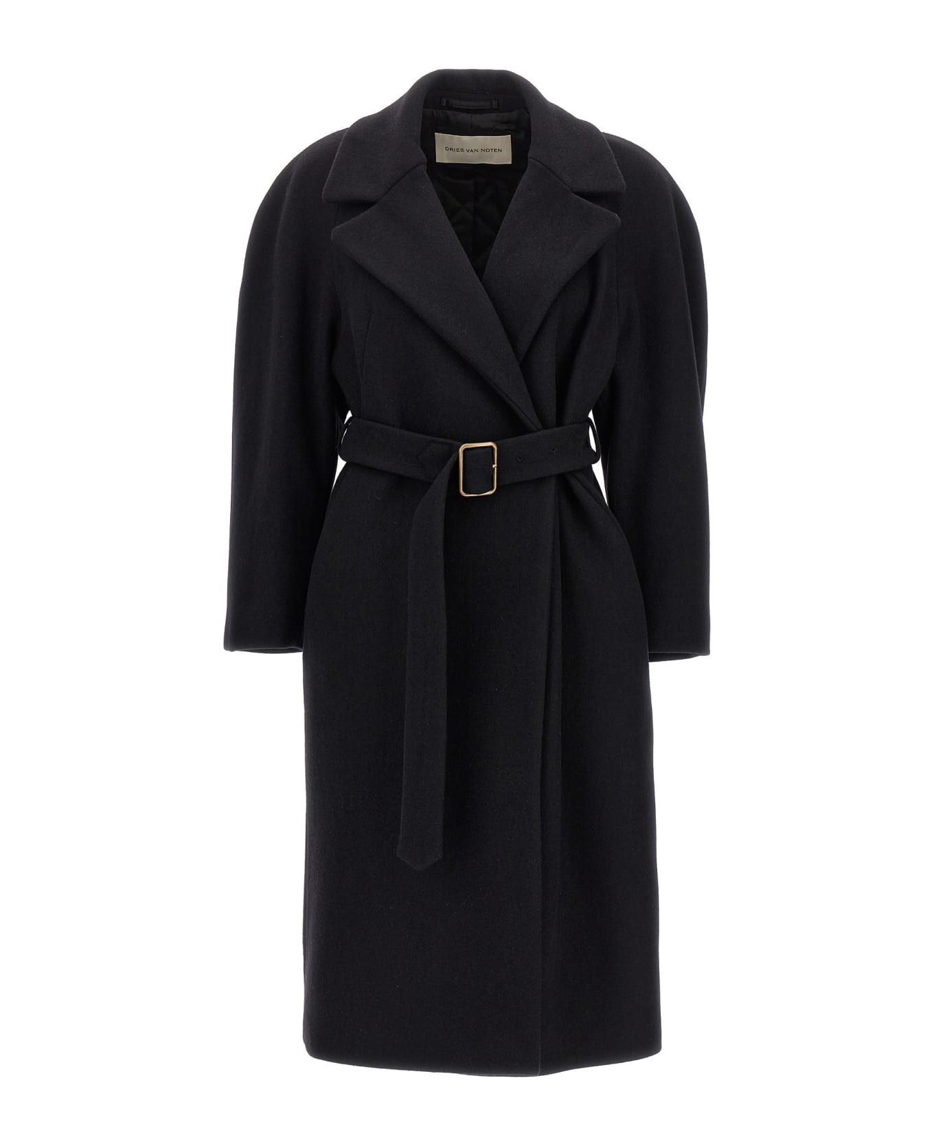 'Royals' double-breasted wool coat with single button and hook closure, adjustable and removable belt and pockets.