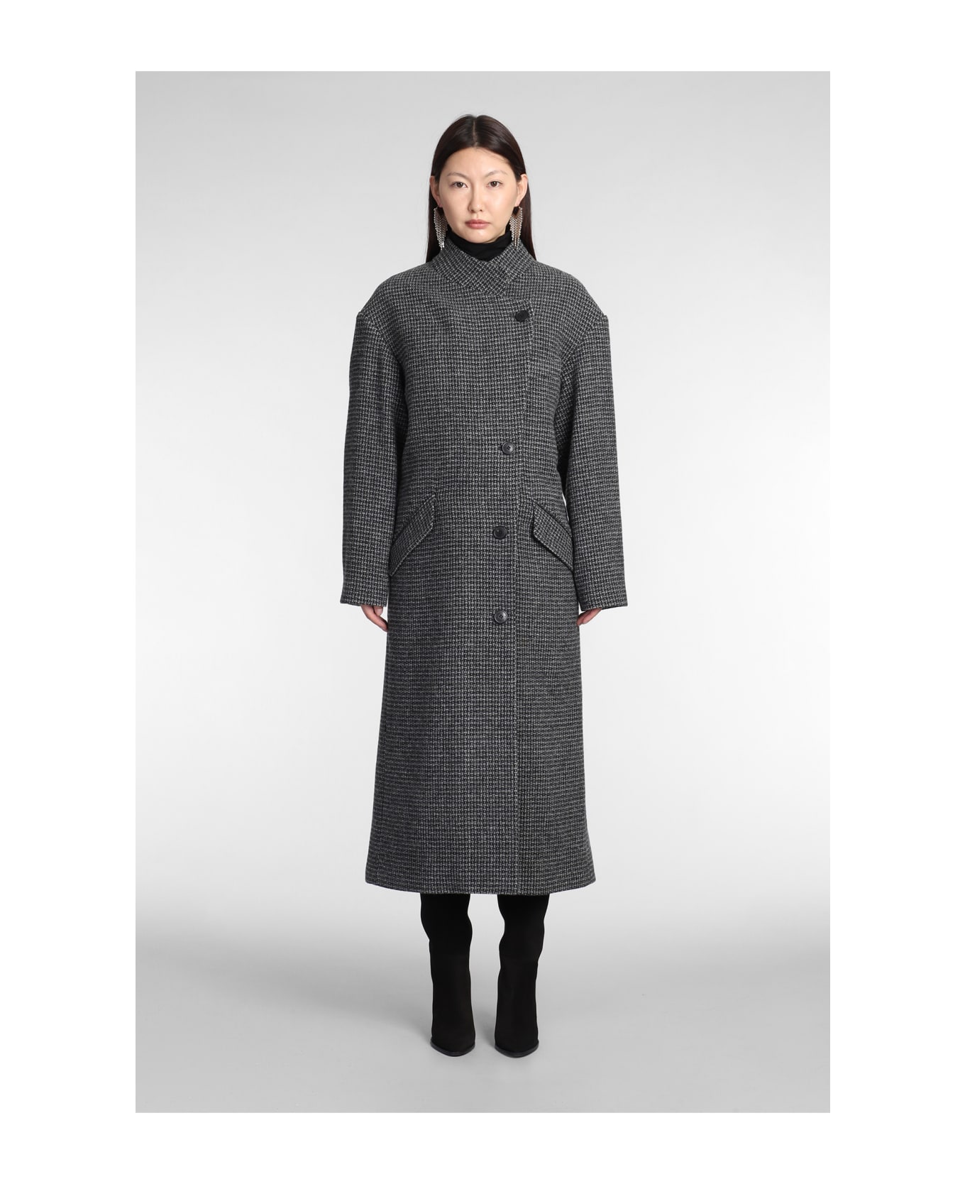 Sabine Coat in grey wool, flap pockets, double breasted closure, square pattern, frontal buttoning, long sleeves, Drop shoulders, 100% wool, Made in Bulgaria, Model is 1. 77 cm and wear size 38