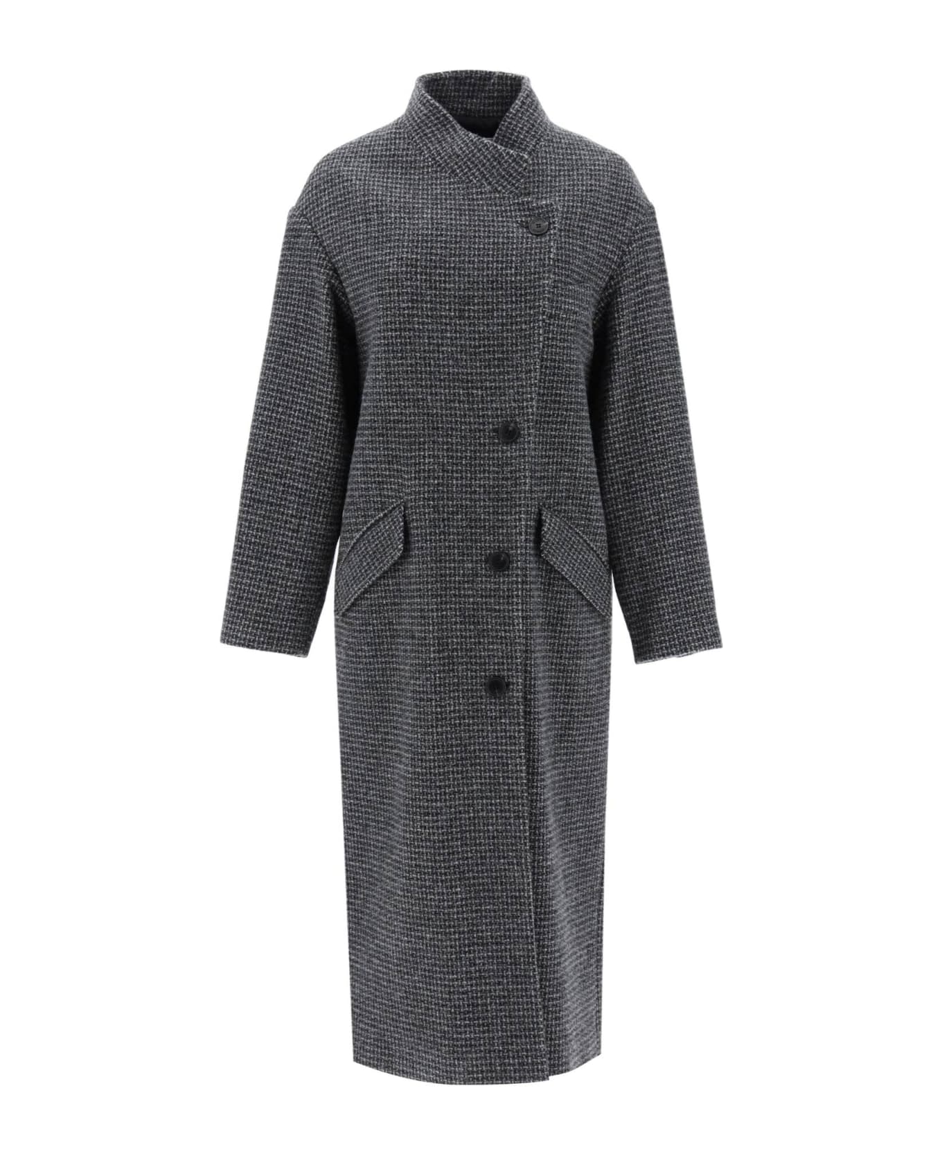 Deconstructed coat by Marant Etoile crafted in pure wool from organic farming, with check motif all-over and double-breasted design with button fastening. It features notch lapel that can be worn buttoned-up, chest welt pocket, jetted pockets with flap and deep center vent at back. Lined interior. Straight cut with calf length and oversized fit enhanced by dropped shoulders. The model is 177 cm tall and wears size FR 36.