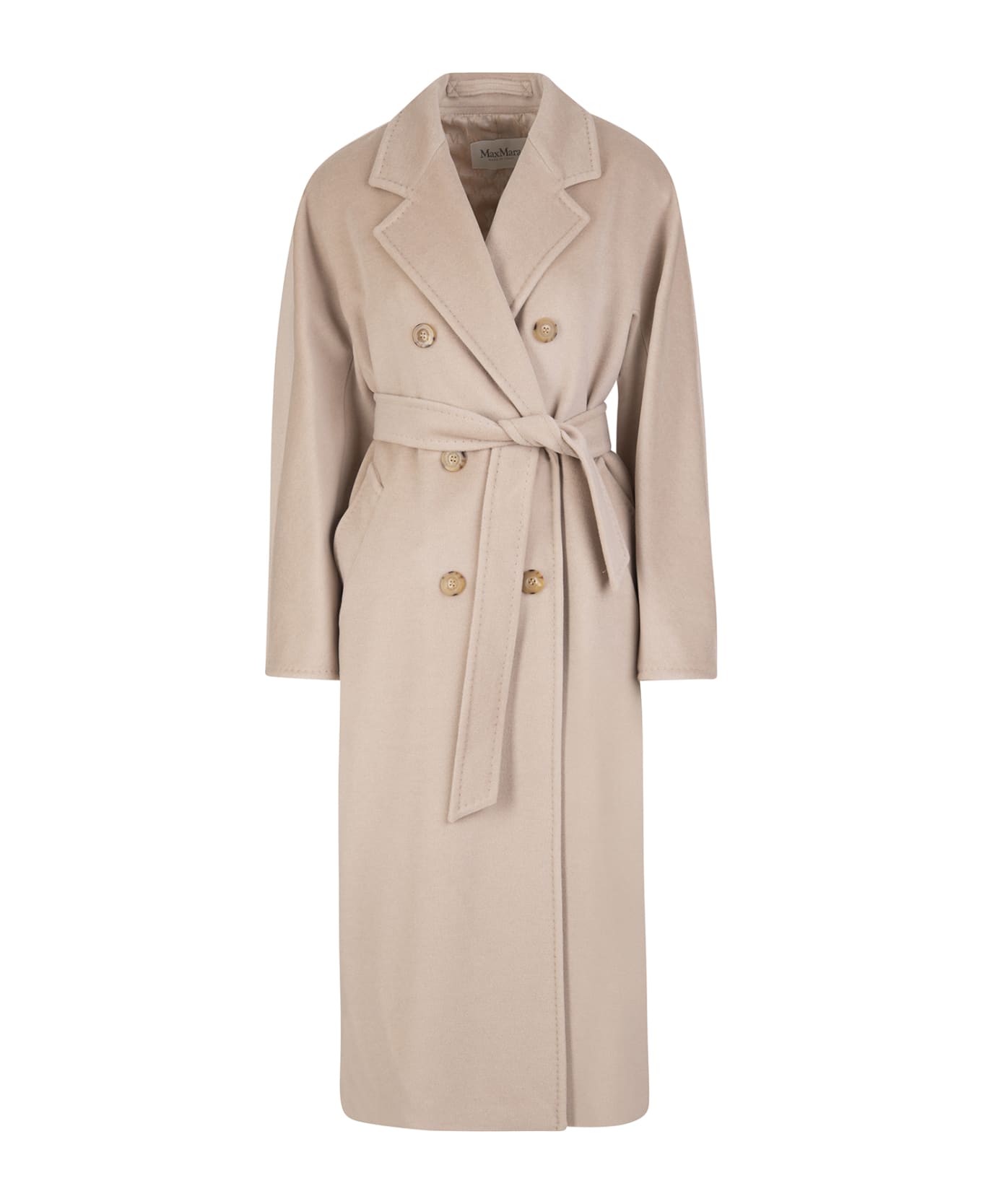 Madame 101801 Icon women's coat by Max Mara made of soft beaver sand-colored wool and cashmere fabric with personalized inner lining and a label that tells the story of the timeless coat par excellence. Long model from the 80s overs line characterized by classic lapel, double-breasted closure, kimono sleeves, side pockets, detachable belt in tone. Length 120 cm.