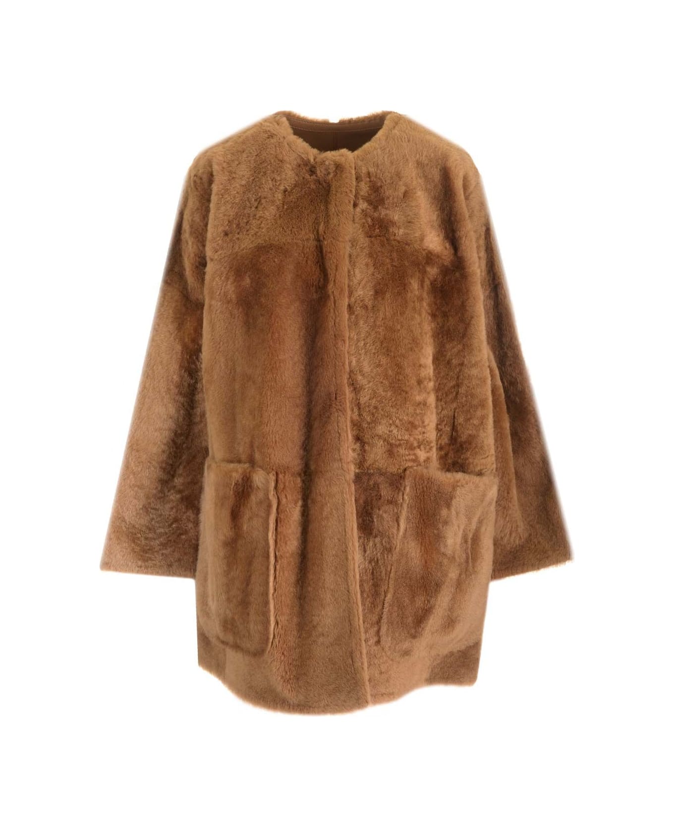 Reversible coat in caramel brown shearling from Max Mara, with crew neck, patch pockets, wide sleeves. Straight cut and loose fit.