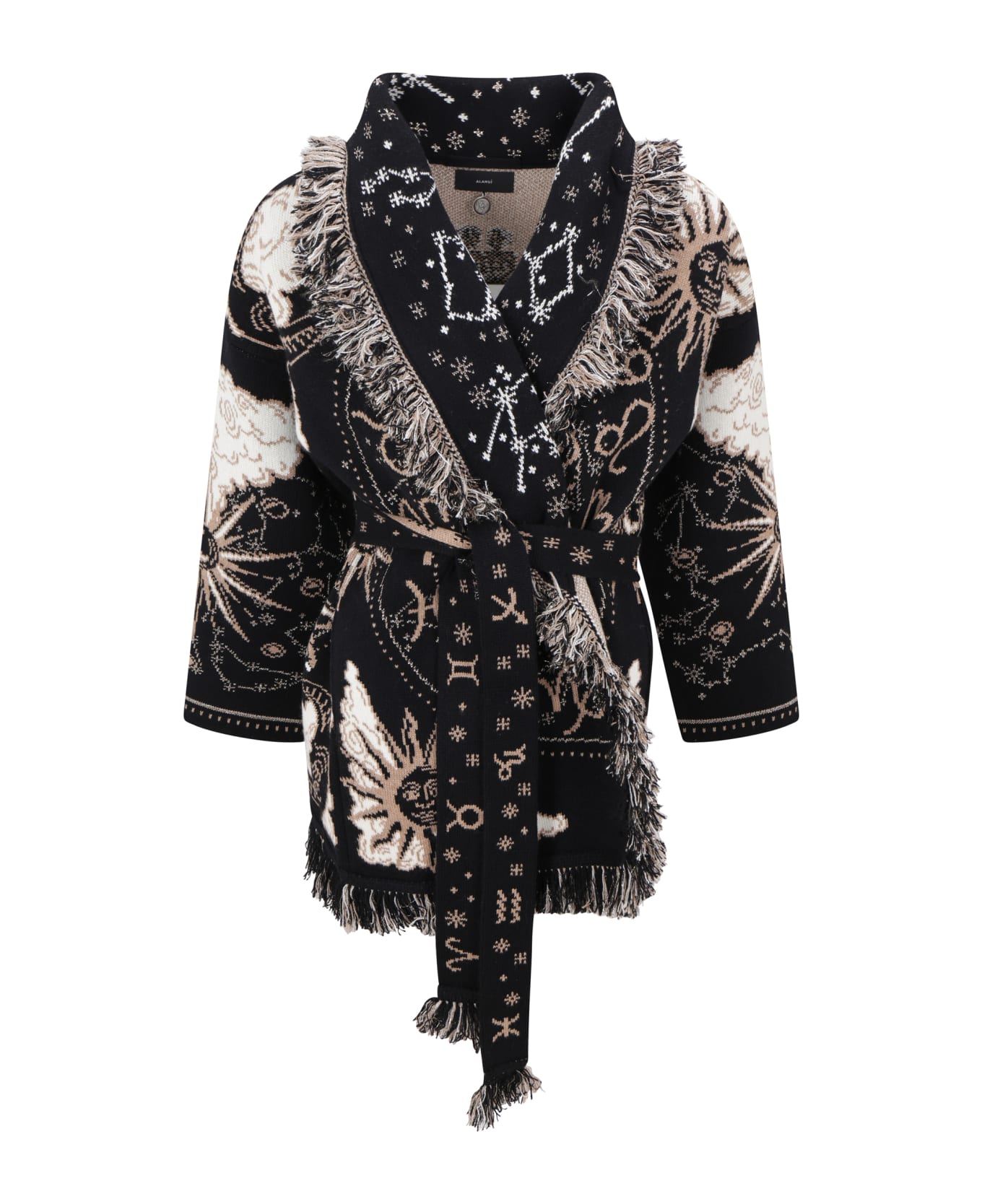 Cashmere signs cardigan by alanui, v-neck on the front, an all-over contrasting embroidered graphic pattern, shawl lapels, an oversized fit, a front fastening with a matching sash, two side welt pockets, and frayed trim and hem.
