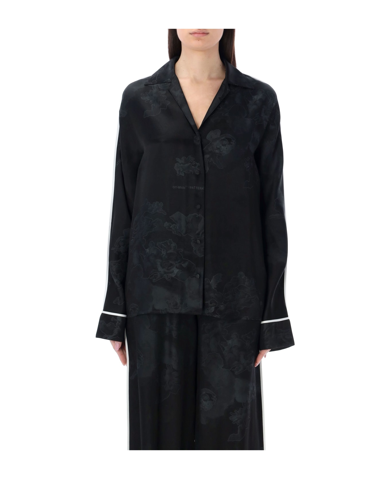 Sky Jacquard Satin Pajama Shirt By Off-white. Featuring: Spread Collar Covered Button Fastening Tonal Jaquard Motif Long Sleeves White Stripe Detail Straight Hem Model Is 1,72 M Tall And She Is Wearing Size 38