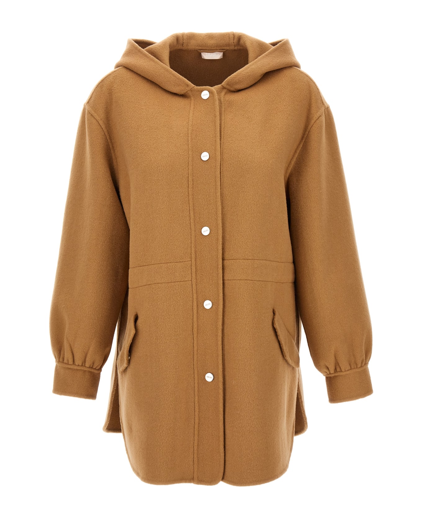 Sneath' wool blend hooded coat with button closure, pockets, adjustable drawstring at the waist, and long cuffed sleeves.