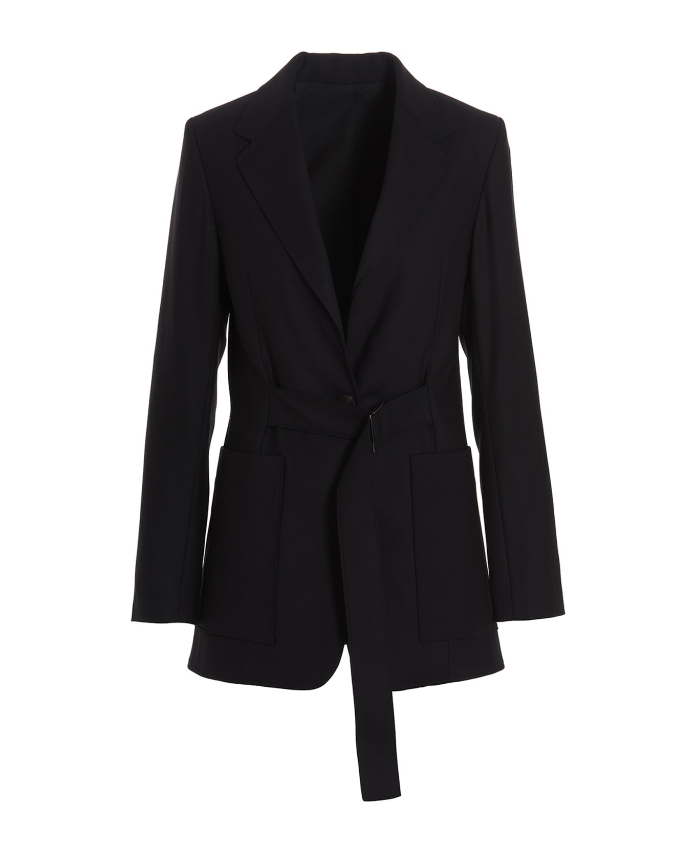Somner' dark blue wool jacket with belt at the waist, pockets, long sleeves and a double split at the back.