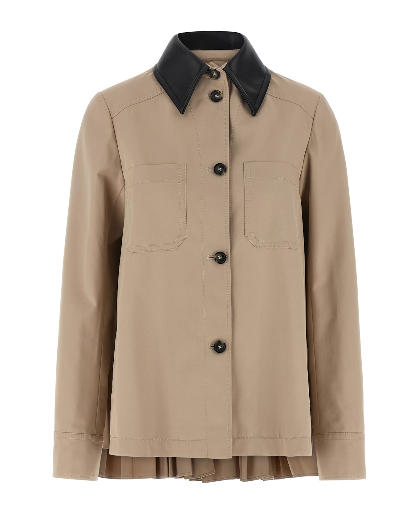 'SpxSuperbo' waterproof technical cotton gabardine overshirt, viscose blend lining, slightly flared silhouette, pleated back, contrast coated jersey shirt collar, front horn button closure, pockets, long sleeves, asymmetric hem.