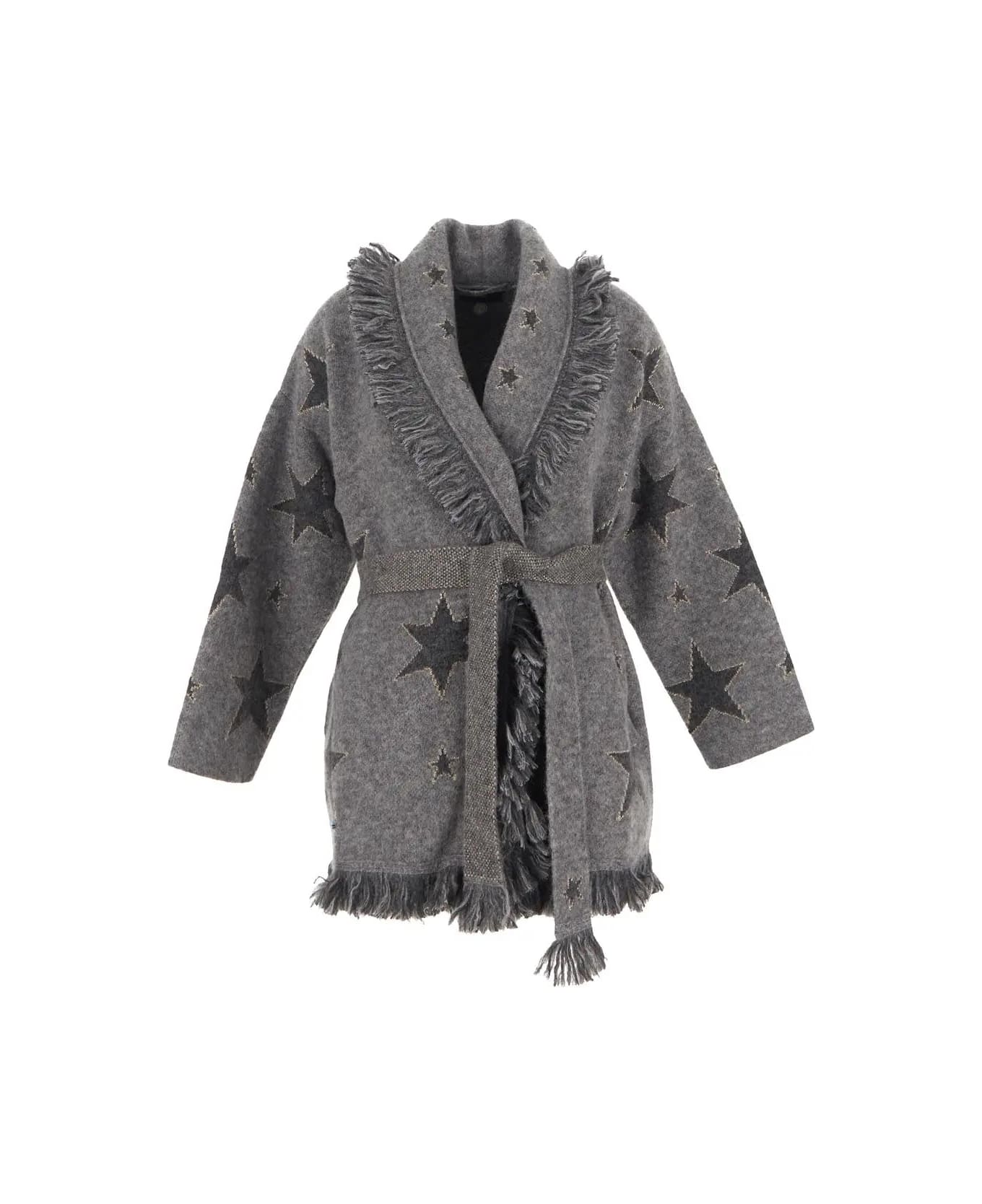 Alanui wrap-around cardigan in cloud thunderstone cashmere blend with stargazing motif, fringed hems, shawl collar, matching self-tie belt, side pockets and loose fit. Composition: 39% Alpaca, 24% Polyamide, 23% Viscose, 7% Virgin Wool, 7% Polyester
