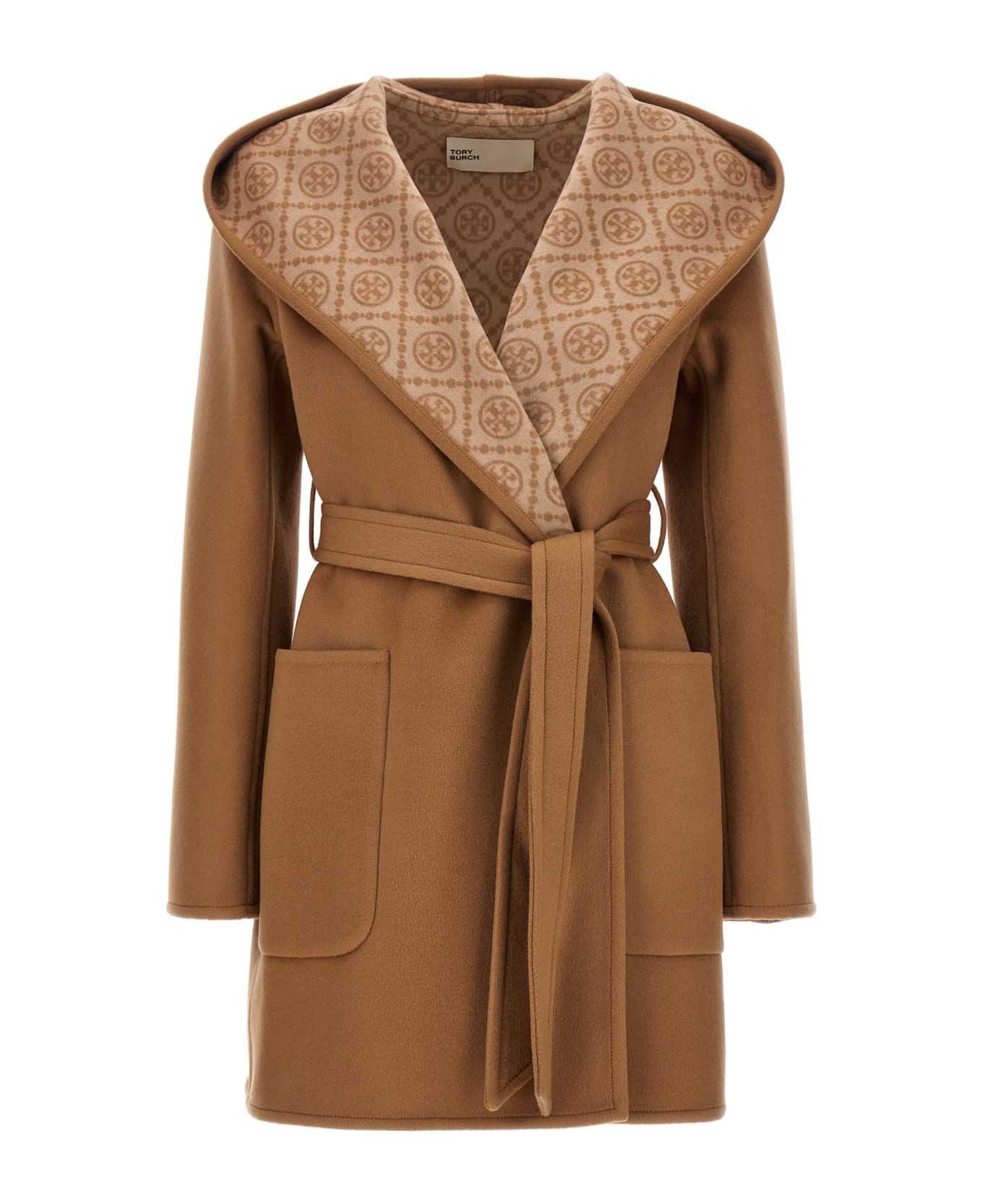 'T-monogram' wool coat with no closure, removable belt and all-over monogram logo inside.