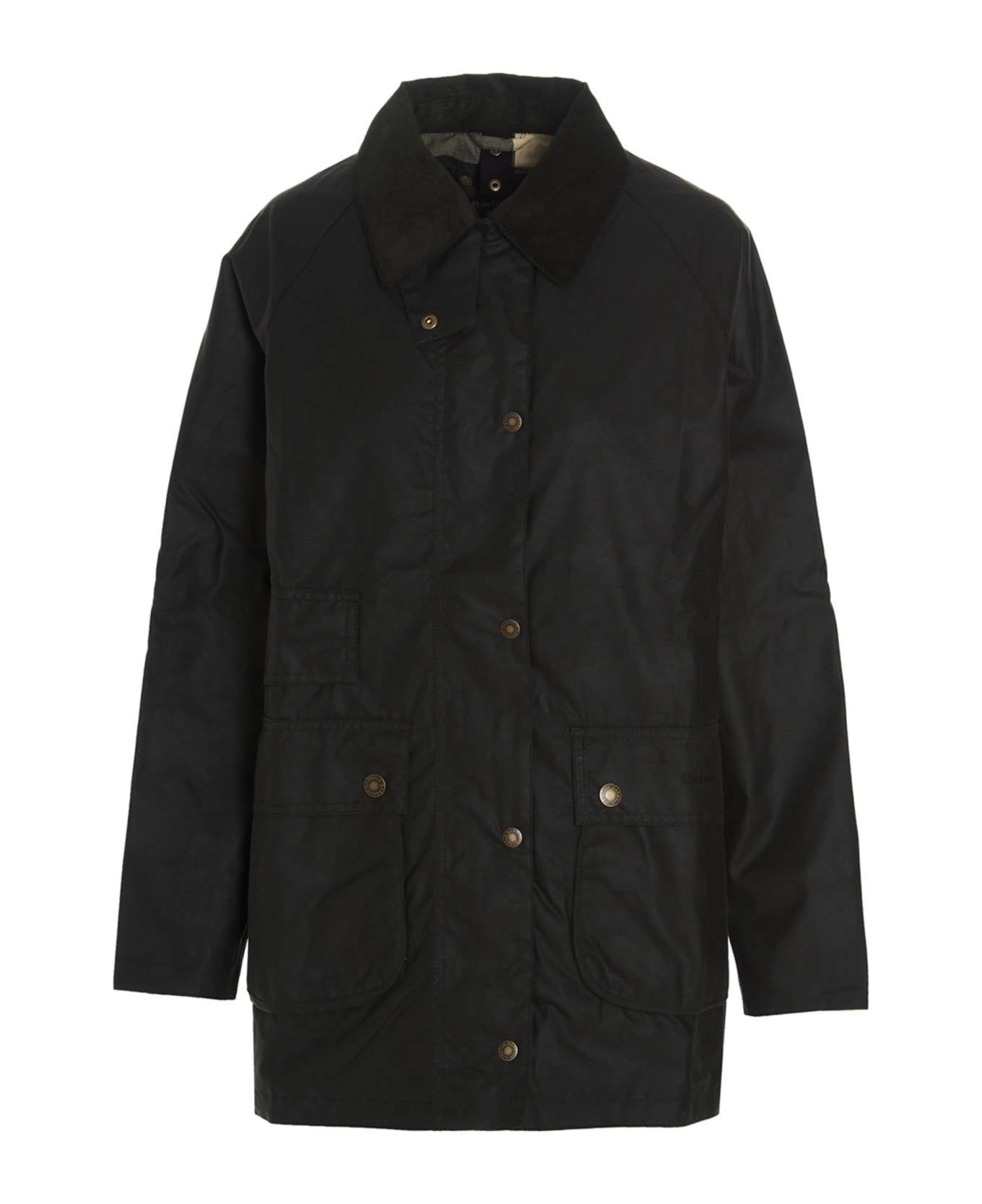 'Tain Wax' single-breasted waxed fabric parka with logo buttons, concealed zip, pockets and a corduroy collar.