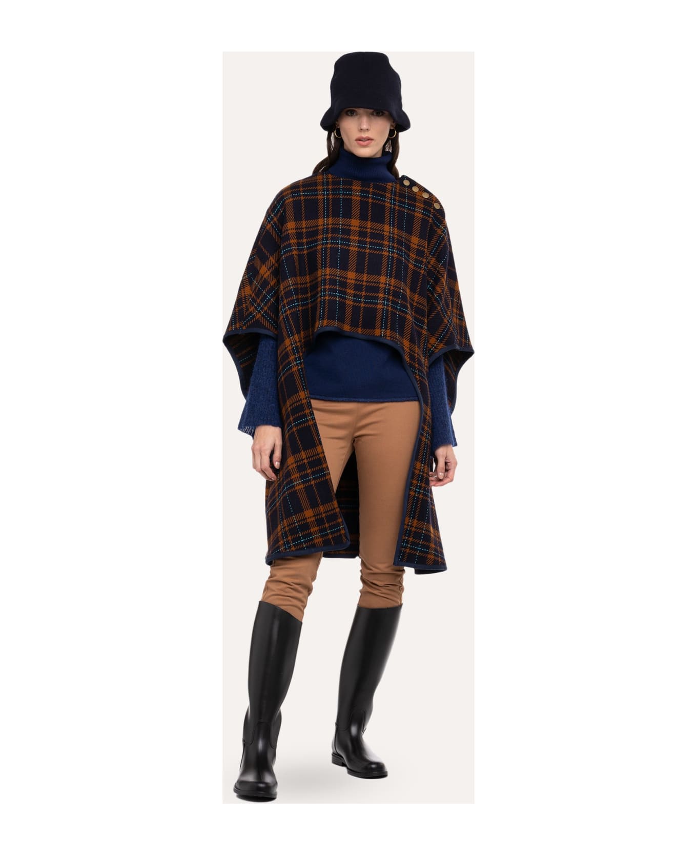 A real must-have for the autumn - winter season is the check wool cape. Its exclusive tartan design by Bottoli and its innovative design make this item a must-have accessory to face the coldest season with style. It presents on the shoulder a buttoning list with gold buttons for easy wearing.